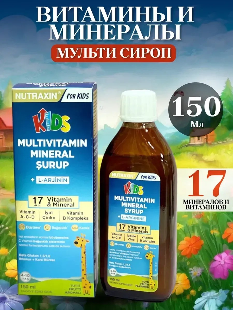 Nutraxin KIDS Мультивитаминный Минеральный Сироп 150 мл; Содержит 17 витаминов и минералов и L-аргинин. Его активные ингредиенты поддерживают рост и иммунитет детей.