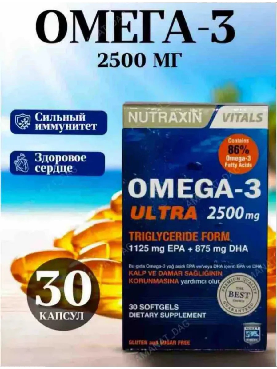 Omega-3 Ultra 2500 or Nutraxin-это рыбий жир, содержащий большое количество ЭПК и ДГК. 1 мягкая желатиновая капсула содержит 86 % омега-3.• Этот продукт содержит омега-3 жирные кислоты ЭПК и (или) ДГК. ЭПК и (или) ДГК помогают поддерживать здоровье сердечно-сосудистой системы. 1 " ЭПК и ДГК способствуют нормальному функционированию сердца. 2 ДГК способствует защите остроты зрения. 3 ДГК способствует защите нормальной работы мозга. 4 Потребление докозагексаеновой кислоты (ДГК) матерью способствует нормальному развитию мозга плода и детей, находящихся на грудном вскармливании. 5 Потребление докозагексаеновой кислоты (ДГК) матерью способствует нормальному развитию глаз у плода и детей, находящихся на грудном вскармливании. РЕКОМЕНДАЦИИ ПО ПРИМЕНЕНИЮ: Взрослым рекомендуется принимать в качестве пищевой добавки по 1 или 2 мягкие гелевые капсулы в день, запивая большим количеством воды. Перед применением рекомендуется проконсультироваться с врачом.