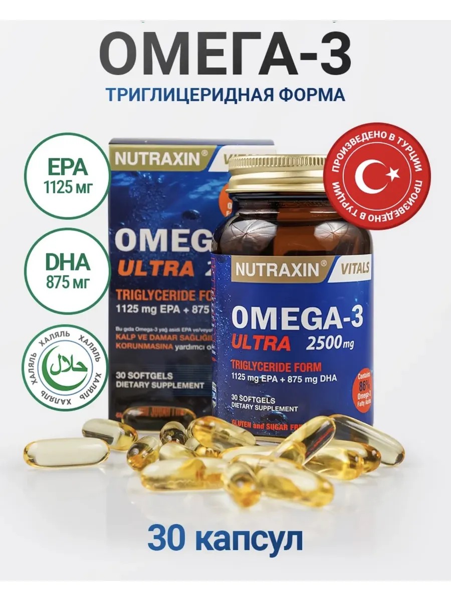 Нутраксин Омега-3 Ультра 2500мг; Это рыбий жир триглицеридной формы с высоким содержанием омега-3 жирных кислот EPA и DHA. Омега-3 Плюс 2500 мг не содержит тяжелых металлов.