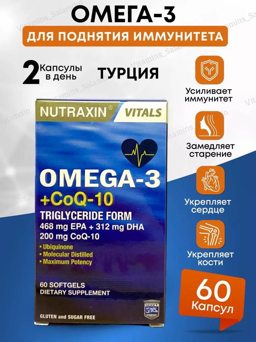 Витаминный комплекс от nutraxin - это ОMEGA 3 рыбий жир в капсулах и коэнзим Q10 с высокой концентрацией компонентов для здоровья сердечно-сосудистой системы, молодости организма и внешней привлекательности. Способствует нормализации функционального состояния сердечно-сосудистой системы; Снижает риск инфаркта и сердечного приступа; Регулирует содержание холестерина в крови; Обеспечивает оптимальное функционирование мозга, усиление памяти; Оказывает антиоксидантное и антистатическое действие, препятствуя преждевременному старению. Витамин д. д3. витамин с. Витамины для волос. Витамины для детей. Омега 3-6-9. Цинк витамины. Омега 3-6-9. Коллаген капсулы. омега 3 1000 мг. Витамины для женщин для мужчин. Рыбий жир в капсулах. Омега3. бады и витамины. Витамин е. Витамин а. витамин d. омега 3 из дикого камчатского лосося. д3 витамин. d3 витамин. комплекс витаминов. Способ применения: по 1 капсуле 2 раза в день с большим количеством воды.