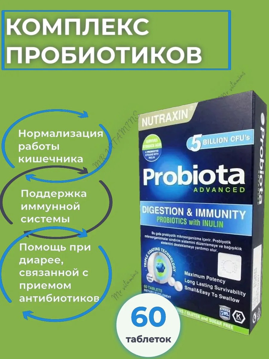 | Комплектация | картонная коробка; блистеры; 60 таблеток с Пробиотиками и инулином Nutraxin Турция |