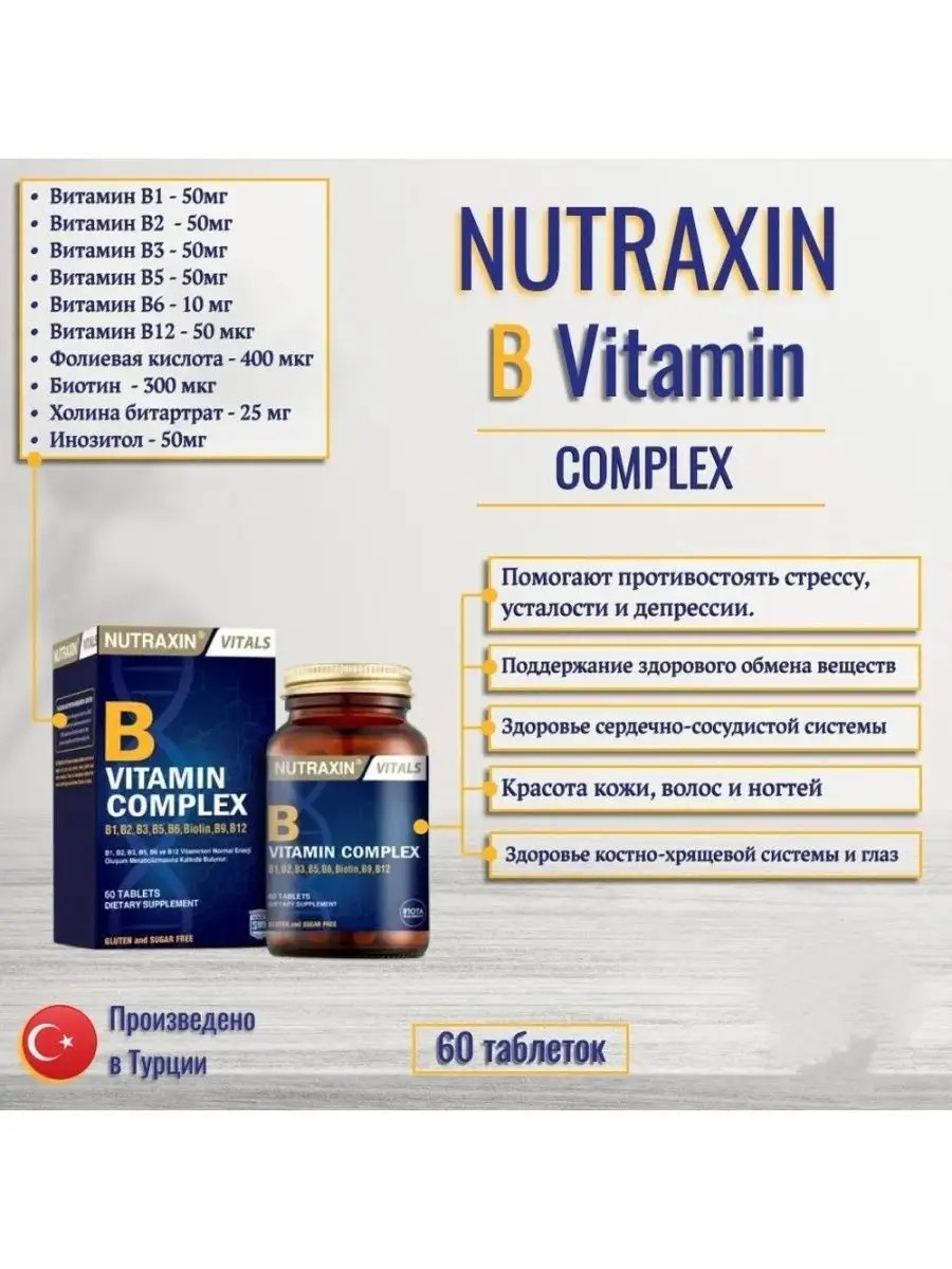 Комплекс нутраксин В; Это смешанный продукт, состоящий из витаминов B1, B2, B3, B5, B6, B12 вместе с фолиевой кислотой, биотином, холином и инозитом. «Тиамин (витамин B1) способствует нормальному энергетическому обмену». «Рибофлавин (витамин В2) способствует снижению утомляемости и утомляемости». «Ниацин способствует поддержанию нормальной кожи». «Витамин B6 способствует нормальному метаболизму белков и гликогена». «Витамин B12 способствует нормальному метаболизму гомоцистеина». «Холин способствует поддержанию нормальной функции печени». Каждую 1 таблетку Витамин B1 (гидрохлорид тиамина)50 мг, Витамин В2 (рибофлавин)50 мг , Витамин B3 (ниацинамид)50 мг Витамин B5 (пантотеновая кислота)50 мг ,Витамин B6 (пиридоксина гидрохлорид)10 мг, Витамин B12 (кобаламин)50 мкг, Фолиевая кислота400 мкг, Биотин (витамин B7, витамин H)300 мкг, Холина битартрат25 мг, Инозитол50 м.