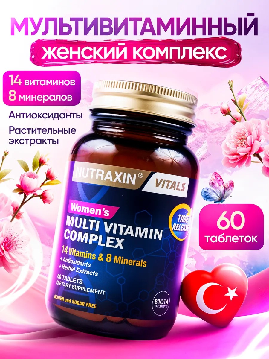 Мультивитаминный комплекс для женщин Multi vitamin complex от турецкого бренда Nutraxin составлен из натуральных ингредиентов, включая магний, цинк, аскорбиновую кислоту, железо, кальций, биотин, хром, селен, фолиевую кислоту, йод, медь, марганец, витамины группы B в1, в6, в12 (в количестве 2,5 мкг) и многое другое. Благодаря уникальному составу, добавка является эффективным средством при синдроме хронической усталости, повышает общий физический и умственный потенциал организма. Этот источник сил и энергии обеспечит ваш организм всеми необходимыми микроэлементами для поддержания здоровья костей, кожи, сосудов, нервов и иммунной системы. Витамины служат своего рода женскими антидепрессантами стимулируют работу мозга, способствуют развитию внимания и снижению уровня тревожности. Также благодаря их приему, происходит укрепление тургора кожи лица и тела. Качественные турецкие витамины не только укрепят ваше здоровье, но также помогут справиться со стрессом, усталостью и депрессией. Препарат, эффективный для улучшения памяти, концентрации внимания и работы нервной системы, благодаря наличию в его составе витаминов b12, b1, в6, также он улучшит вашу форму для занятий спортом. Поливитаминный комплекс благотворно влияет на потенцию, способствует повышению активности, ускорению метаболизма, укреплению иммунной системы. Это прекрасное средство для восстановления после тренировок, преодоления чувства усталости, а также для улучшения состава крови. Могут заменить специальные спортивные поливитамины, так как содержат все вещества, необходимые для сохранения и приумножения силы и выносливости и станут отличным дополнением к пищевым продуктам. Упаковка комплексных витаминов включает капсулы в количестве 60 штук, которых хватит на месяц применения.
