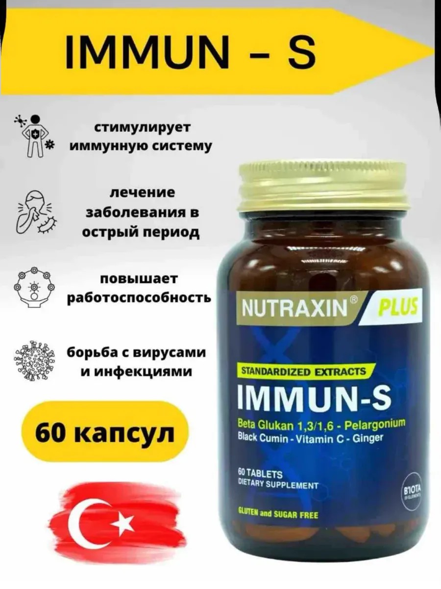 Диетическая добавка IMMUN-S Nutraxin содержит исключительно стандартизированные экстракты и сырье. Так, в его составе Бетаглюканы широко применяются для укрепления иммунной системы улюдей, защитные силы которых были ослаблены в результате синдрома хронической усталости или чрезмерных физических и эмоциональных нагрузок, в том числе из-за радиации или химиотерапии. Формула IMMUN-S Nutraxin усилена семенами черного тмина, который помогает улучшить состояние иммунной системы, бороться с раком, уменьшить отеки и аллергические реакции, действуя как антигистаминное средство. Экстракт герани усиливает нормальную защитную реакцию организма на инфекции извне. Область применения: Способствует гармонизации иммунной системы. Полезен в качестве профилактики инфекционных заболеваний.Эффективен даже во время заболевания в острый период. Производит противовоспалительный эффект и повышает работоспособность. Помогает быстро и точно находить атипичные клетки и нейтрализовать их на раннем этапе. Рекомендации по применению: Принимать по 1 таблетке 2 раза в день, запивая большим количеством воды. Подходит для вегетарианцев и веганов. Возраст: 18+ Противопоказания: Повышенная чувствительность к любому из компонентов. Возраст: 18+Меры предосторожности: Не превышать рекомендованное количество для ежедневного употребления. Не заменять диетической добавкой полноценный рацион питания. Беременным и кормящим женщинам и людям, которые принимают лекарства или проходят медикаментозное лечение, следует проконсультироваться с врачом перед употреблением продукта.Возраст: 18+Особые указания: Биологически активная добавка к пище, не является лекарственным средством. Перед применением рекомендуется проконсультироваться с врачом. Условия хранения: Продукт следует хранить в недоступном для детей месте при температуре от 15°С до 25°С и относительной влажности воздуха не более 60%. Состав каждые 2 таблетки содержат: Экстракт корня африканской герани (Pelargonium sidoides) - 200 мг. Экстракт семян черного тмина (Nigella sativa) - 200 мг. Имбирь (Zingiber officinale) Экстракт корня - 200 мг. Витамин C - 400 мг. Бета-глюкан 1,3/1,6 - 200 мг. Микрокристаллическая целлюлоза, сополимер поливинил-пирролидона и винилацетата, кроскармеллоза натрия , поливинил пролидон , диоксид титана , оксид железа , магниевые соли жирных кислот , диоксид кремния . Не содержит искусственных консервантов , красителей , ароматизаторов и таких потенциальных аллергенов, как сахар , соль , крахмал , дрожжи , глютен , соя , пшеница и молокопродукты.