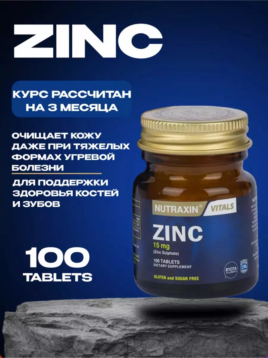 Zinc. An essential element. It activates at least 100 enzymes that affect hormones, skin, hair, and nails. It also reduces blood sugar and improves reproductive health. Zinc is concentrated in every cell of the human body. Without it, the pancreas does not produce the hormone insulin, the immune system weakens, and susceptibility to infections and flu increases. Skin and the body as a whole age, and nails become brittle. Since the human body does not accumulate excess zinc, it must be consumed regularly as part of the diet. Common dietary sources of zinc include red meat, poultry, and fish. Zinc deficiency can cause short stature, decreased ability to taste food, and failure of the testicles and ovaries to function properly. Taking zinc significantly improves the structure of hair and nails, skin quality, and overall health, strengthens the immune system, and is especially helpful for illnesses. Take 1 tablet daily.