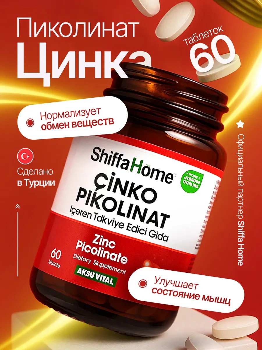 Zinc Picolinate Пиколинат цинка - витаминный комплекс от Shiffa home, рекомендуются в качестве дополнительного источника цинка. Цинк - первая помощь при ОРВИ, простудах, гриппе и любых вирусных заболеваниях. Цинк является антиоксидантом, способствует повышению сопротивляемости организма к инфекциям, позволяет регулировать деятельность сальных желез справлятьс с жирным блеском и воспалениями на коже, препятствует выпадению волос, участвует в синтезе коллагена, стимулирует секрецию инсулина, участвует в процессе сперматогенеза. Таблетки Пиколинат цинка содержат цинк в органической хелатной форме которая легко усваивается организмом и минимизирует риски развития побочных эффектов со стороны желудочно-кишечного тракта.