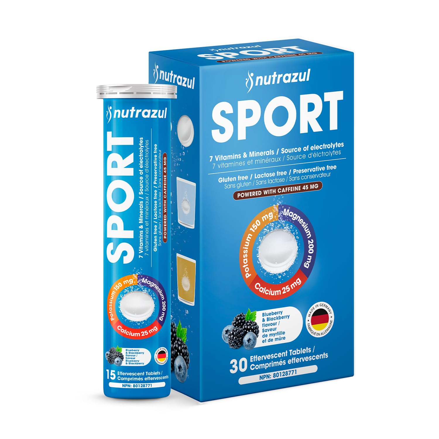 Clean Formula Dosage: Non-GMO, preservative, gluten, and lactose-free. For adults (19 ), dissolve 1 tablet in 8.45 oz water with food. Take a few hours before after medications. These effervescent electrolyte packets offer convenient hydration. Refreshing Blueberry Blackberry Flavor: Experience a delicious and naturally fruity taste with every serving. Simply dissolve a tablet in water for a quick, flavorful, and hydrating drink that's easy to enjoy on the go. Active Lifestyle Fast-Acting: Whether before your workout or mid-game, Nutrazul SPORT enhances hydration, focus, and endurance. Dissolves quickly in water for rapid absorption with a great-tasting Blueberry Blackberry flavor, no pills. 7 Vitamins Minerals Blend: Contains a powerful combination of Vitamins B1, B2, B6, and other essential minerals to help maintain healthy energy metabolism and contribute to overall wellness for an active lifestyle. Hydration Muscle Function: Formulated with 200 mg Magnesium, 150 mg Potassium, 25 mg Calcium, 10 mg Zinc, and 45 mg Caffeine to help maintain hydration, assist muscle function, provide electrolytes, and help maintain energy levels throughout the day.