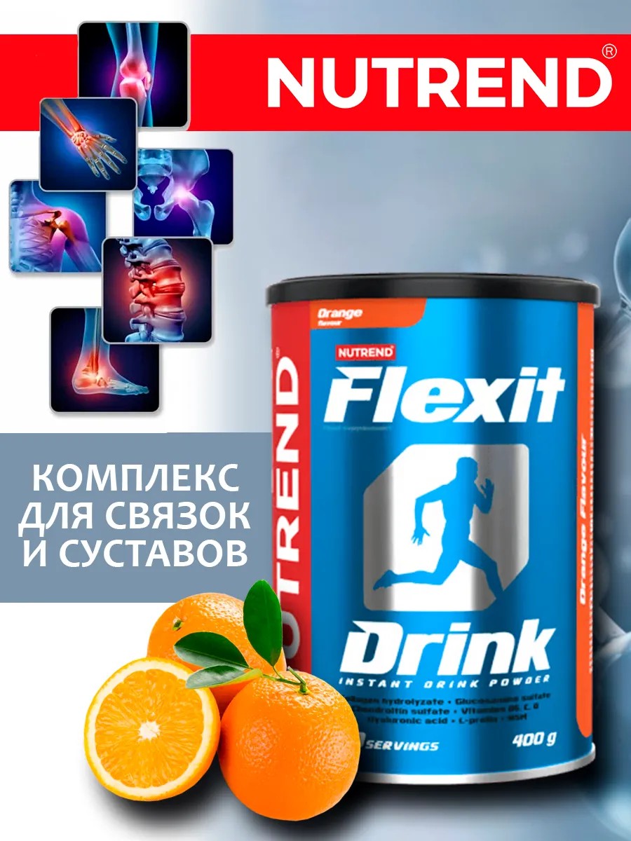 Flexit Drink Chondroprotector Complex, 400 g, Orange. This product is a comprehensive dietary supplement designed for joints. FLEXIT DRINK NUTREND contains glucosamine sulfate, chondroitin sulfate, collagen proteins and peptides, amino acids, methylsulfonylmethane, hyaluronic acid, substances that prevent osteoporosis, and vitamins. FLEXIT DRINK is designed to enhance nutritional properties and enrich food in case of joint problems, for people whose joints experience increased stress and are at risk of wear and tear (during sports, with excess body weight), for people with limited mobility or increased joint fatigue, for women to prevent osteoporosis, and for people who do not consume enough calcium. Flexit Drink is a preventative and restorative system designed for connective tissue (joints, joint capsules, cartilage, tendons, ligaments, etc.) and bone tissue. The product's formula, developed in accordance with the latest clinical research, ensures its high effectiveness. Flexit Drink contains the main elements or starting products for the formation of cartilage tissue: glucosamine sulfate, chondroitin sulfate, collagen proteins and peptides, amino acids, methylsulfonylmethane; substances involved in accelerating recovery processes: vitamins C, B6, D3; a substance that promotes hydration of the intercellular space, which leads to its greater resistance to external influences - hyaluronic acid; substances that prevent the development of osteoporosis - calcium and magnesium in organic, easily digestible form. MSM (methylsulfonylmethane) Sulfur in methylsulfonylmethane helps the body produce essential amino acids such as methionine and cysteine. L-proline is an amino acid essential for collagen formation and accelerates the recovery of damaged cartilage and ligaments. Vitamins C, B6, and D3 support vital functions, accelerate recovery processes, and strengthen the immune system. Calcium is essential for bone formation. Magnesium works in conjunction with calcium; it is necessary for nerve and muscle function and is known as an "anti-stress" mineral. FLEXIT DRINK is therefore an essential part of sports and professional nutrition. This product makes an excellent gift for men and women who care about their health and beauty. Recommended dosage: To protect existing connective tissue: take 10 g once daily in the morning on an empty stomach. In case of increased wear and tear and injuries: take 20 g once daily in the morning on an empty stomach. Children 6 years and older: 5 g daily. Ensure increased fluid intake! Do not exceed the recommended dosage. Directions: Mix 10g (20g) of powder with 250ml of water. Add the required amount of powder to a small amount of water, stir, and top up to the desired volume.