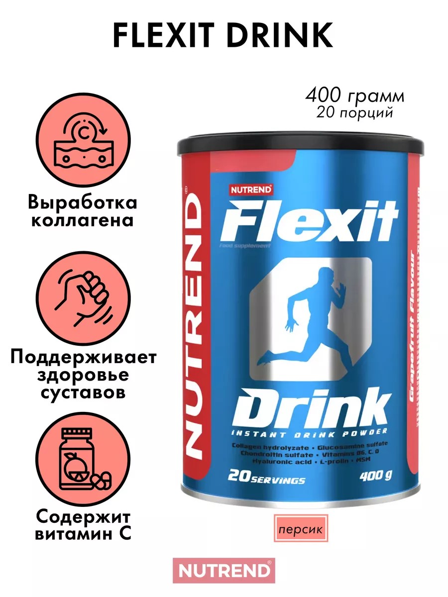 Витамины для суставов и связок FLEXIT DRINK Nutrend 400 г, персик. Flexit Drink – это предупреждающая и восстанавливающая система, предназначенная для соединительных (суставов, суставных капсул, хрящей, сухожилий, связок…) и костных тканей. Продукт представляет собой комплексную пищевую добавку, предназначенную для суставов. FLEXIT DRINK содержит глюкозамин сульфат, хондроитин сульфат, белки коллагена и пептиды, аминокислоты, метилсульфонилметан, гиалуроновую кислоту, вещества, препятствующие возникновению остеопороза: кальций, магний, витамины. FLEXIT DRINK предназначен для повышения питательных свойств и обогащения пищи в случае проблем с суставами, для людей, чьи суставы испытывают повышенную нагрузку и подвергаются риску изнашивания (во время занятий спортом, при избыточном весе тела), для людей с ограниченной подвижностью или повышенной утомляемостью суставов, для женщин с целью предупреждения возникновения остеопороза, для лиц, потребляющих недостаточное количество кальция. Пищевая добавка содержит подсластителихондроитин сульфат, глюкозамин сульфат, гиалуроновая кислота, метилсульфонилметан, L-пролин, кальций, магний, витамины C, B6, D3.