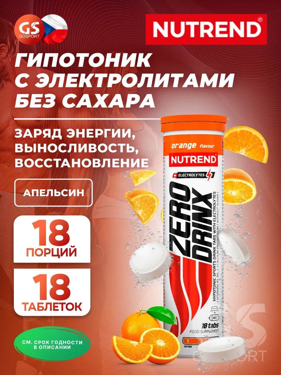Expires until February 20, 2027. ZERODRINX TABS Isotonic Drink, 18 Tablets, Orange. NUTREND's ZERODRINX TABS sports nutrition is a complex of fruit-flavored tablets for making an isotonic drink. Each serving provides a blend of electrolytes and vitamins, which is always essential during intense training or competition. By replenishing electrolytes, you maintain proper hydration and high performance. During exercise, the body loses electrolytes—minerals and trace elements necessary for normal functioning—through sweat. It's important to replenish these losses, and this isotonic drink can help. It's easy to prepare. Simply dissolve one tablet in 500 ml of water, and you'll have a drink with valuable electrolytes to maintain proper hydration and high performance during training or competition. It can also help reduce your body's recovery time after physical activity. This supplement not only helps boost endurance and energy, but is also essential for maintaining good health. The isotonic drink's component matrix is made up of minerals and vitamins. The mineral components are calcium, magnesium, and potassium. In our bodies, they act as electrolytes. Why do we need electrolytes? Electrolytes maintain the body's water-salt balance, which is important for normal muscle and nerve function. When fluid levels are within normal limits, the body better eliminates accumulated toxins and metabolic waste. A deficiency in electrolytes leads to muscle cramps and spasms, as well as muscle pain after exercise. These components are not only an integral part of professional nutrition but also indispensable for your beauty and health. Isotonic ZERODRINX will be your ideal companion during workouts, strength training, and fitness. It's enriched with vitamins and sugar-free, making it an excellent choice for those who care about their health and diet. It's equally suitable for both men and women. Directions for use: Dissolve 1 tablet in 500 ml of water. Drink during exercise. Maximum 2 tablets per day. Do not exceed the recommended dosage.