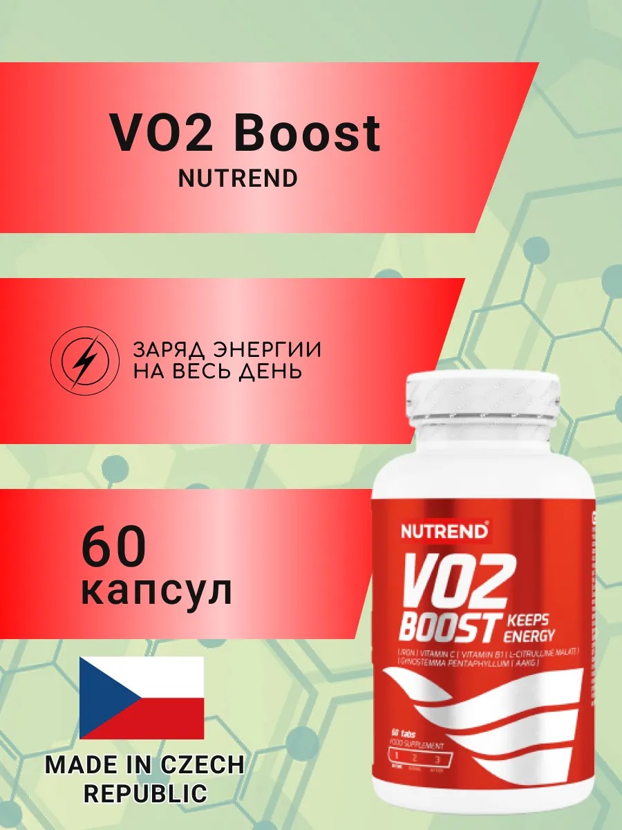 Nutrend VO2 Boost - это продукт, созданный специально для активных спортсменов, который помогает увеличить выносливость и уровень энергии. В состав препарата входят аминокислота AAKG, цитруллин малат и железо для переноса кислорода в организме, снижения утомляемости, а также витамин С для нормальной работы иммунной системы. Кроме того, в рекомендуемой дозе из 4 таблеток содержится 200% от рекомендуемой суточной нормы витамина В1, способствующего нормальному энергетическому обмену и правильной работе сердца.