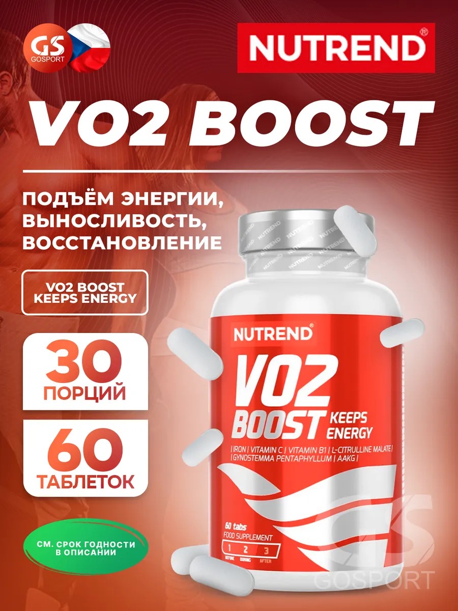 Expires until August 12, 2027. VO2 BOOST Pre-Workout Complex (60 tablets). VO2 max is an important indicator of an athlete's physical fitness. Nutrend's VO2 BOOST pre-workout complex is designed to improve athletic performance. Key ingredients include the amino acid AAKG, citrulline malate, and iron to transport oxygen throughout the body and reduce fatigue, as well as vitamin C for normal immune system function. In addition, the recommended dose of 4 tablets contains 200% of the recommended daily intake of vitamin B1, which contributes to normal energy metabolism and heart function. VO2 BOOST promotes the elimination of lactic acid, increases endurance during a race, and reduces recovery time afterward. Therefore, VO2 BOOST pre-workout is a component of professional sports nutrition for athletes and those involved in sports or fitness. The product is suitable for men and women who care about their health and beauty. Directions for use: For activities up to 60 minutes: 2 tablets approximately 45 minutes before the start of physical activity. For activities longer than 60 minutes: 2 tablets approximately 45 minutes before the start of physical activity and 2 tablets midway through the activity. The maximum daily dose is 4 tablets. Drink plenty of water. Do not exceed the recommended dosage.