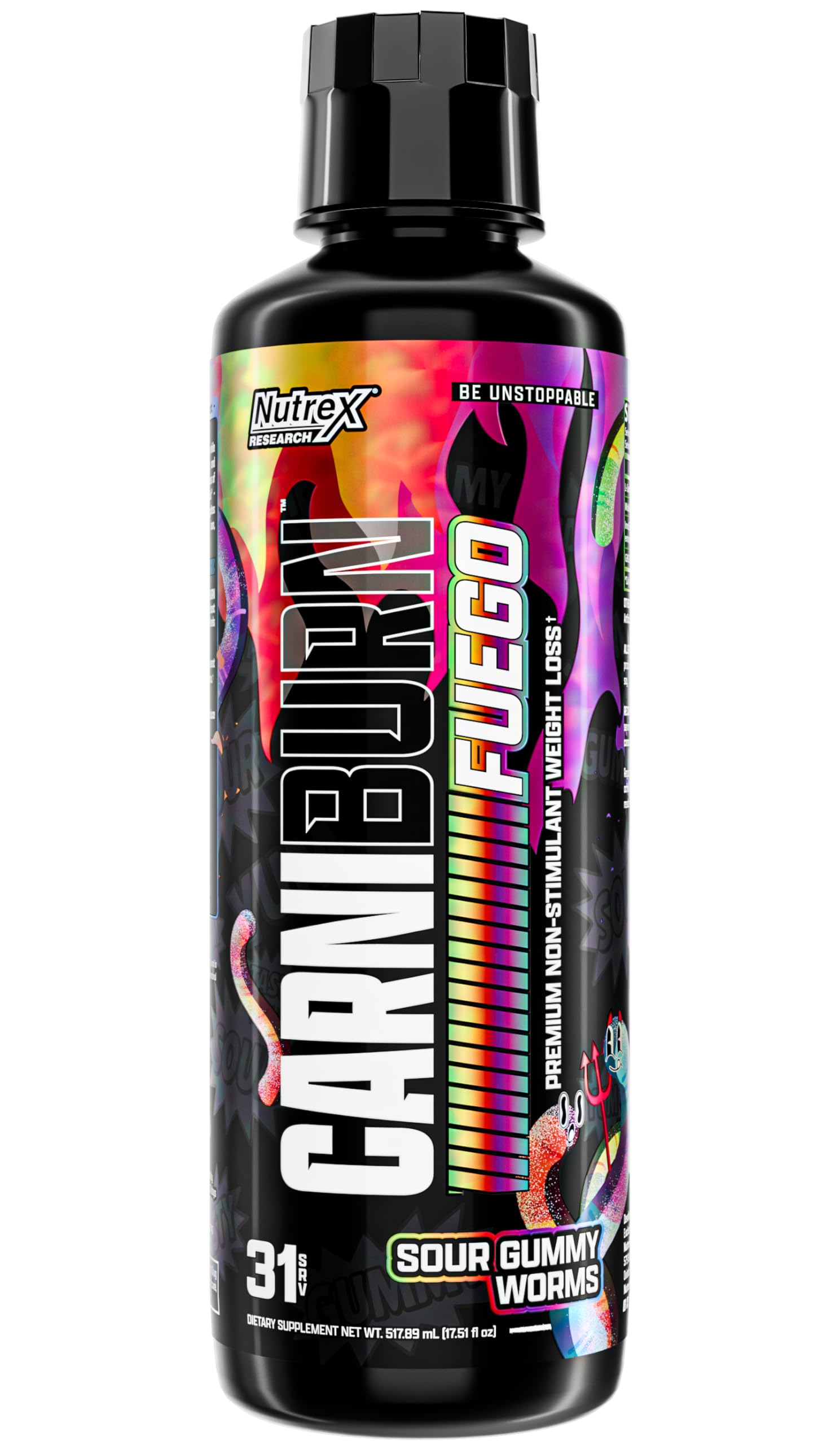 Nutrex Research Carniburn Liquid L Carnitine 3000mg Thermogenic Liquid Fat Burner for Men & Women with MitoBurn InnoSlim GBBGO - Stimulant Free Metabolism Booster - Sour Gummy Worms 31 SV Sour Gummy Worms 17.52 Fl Oz (P