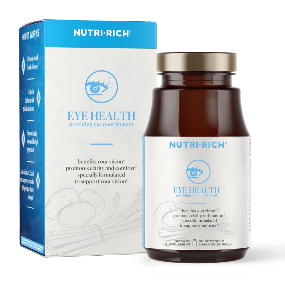 ?Nutri-Rich is a family-owned made in California company. We make products free of artificial additives. Our supplement contains 60 softgels – 1 softgel per day for 2 months. ?Taking care of your eyes gets more important as we age — and we're here to make it simple. Our Eye Health Softgels are designed to support your vision every day, with a gentle, effective formula that helps with: Overall eye health, eye strain from screens, dry, tired eyes and protection against blue light. ?Vitamin C: (ascorbic acid) Our Vitamin C is designed to do more than just boost your immune system—it also supports natural collagen production for healthy skin, hair, and joints. ?Packed with powerful antioxidants, powerful lutein and zeaxanthin duo act like powerful antioxidant properties, especially beneficial for eye health — helping your eyes from screen strain in today's digital world. ?Our advanced eye health supplement is carefully formulated to help counter the effects of oxidative damage by delivering a targeted blend of essential nutrients that support the eyes.