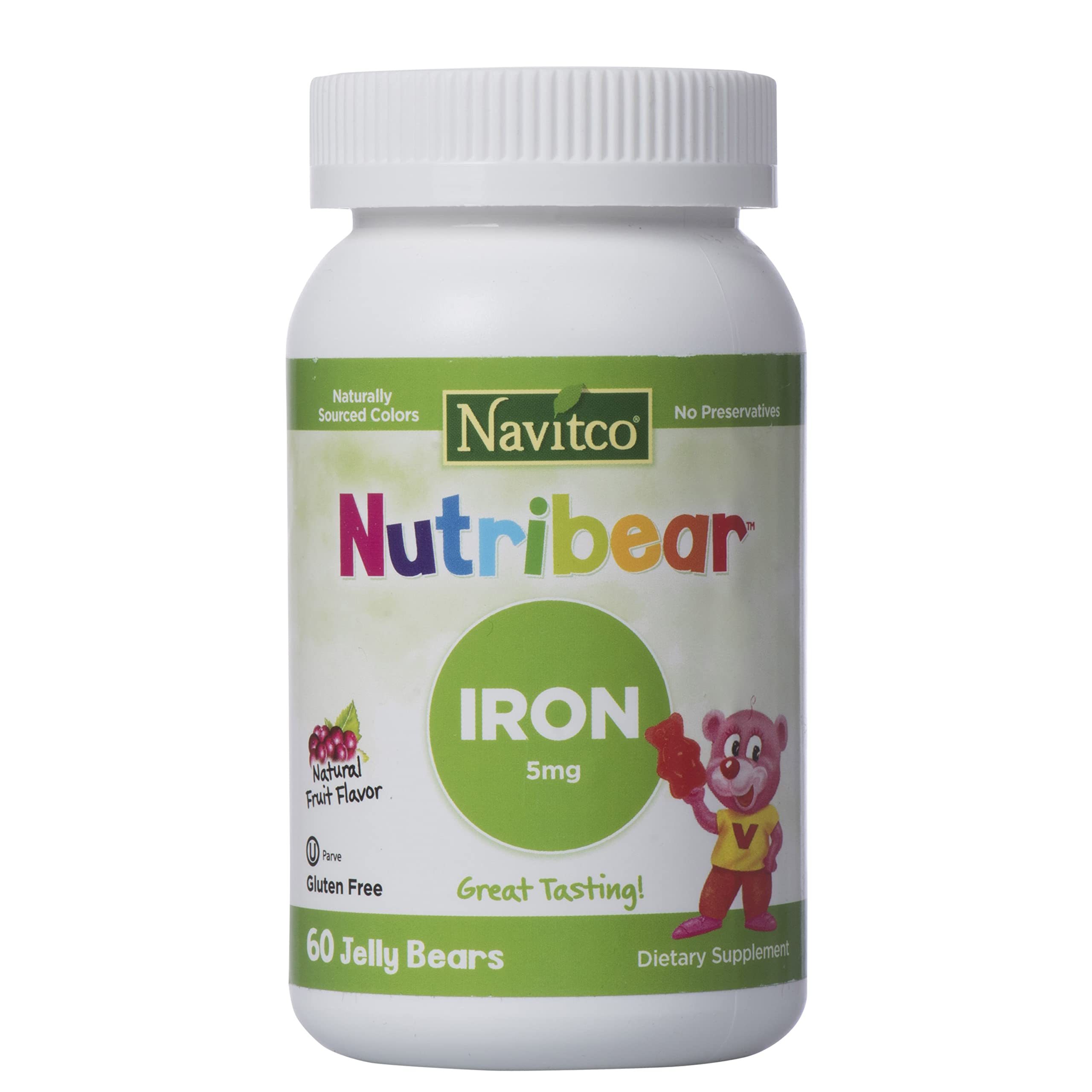 Kosher certified. "Vegetarian Formula". No Artificial Colors, No Preservatives. Natural Fruit Flavor, Your Kids will Love it. Navitco, "NutriBear" Iron 5 mg, Great Tasting, (2 Packs of 60 Jelly Bears).