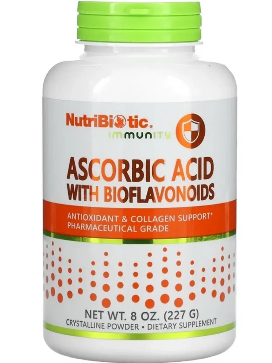 NutriBiotic Ascorbic Acid with Bioflavonoids contains 100% pharmaceutical grade vitamin C (L-ascorbic acid) and lemon bioflavonoids in a highly bioavailable, soluble crystalline powder.