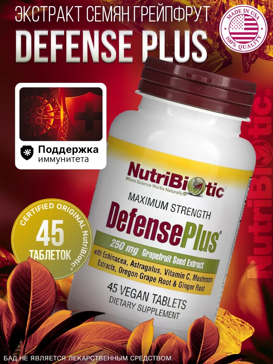 Таблетки NutriBiotic DefensePlus — это уникальная формула, сочетающая экстракт косточек грейпфрута, витамин C, экстракт эхинацеи, корень астрагала, экстракт корня имбиря, корень магонии падуболистной, экстракт тысячелистника, цинк и экстракты грибов рейши, майтаке и шиитаке.