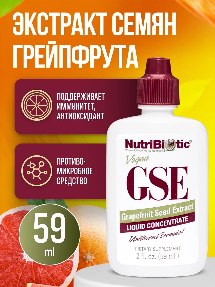 Жидкий экстракт семян грейпфрута GSE от компании NutriBiotic — это натуральный продукт, созданный на основе семян и мякоти грейпфрута. Объем упаковки составляет 59 мл, что делает его удобным для использования как дома, так и в поездках.