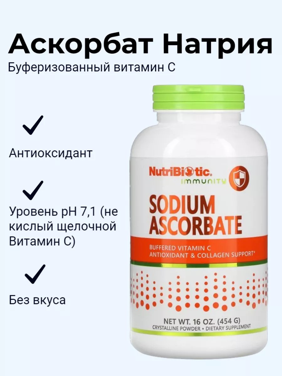Натрий в этом продукте отличается от обычной поваренной соли, так как он не сочетается с хлором. Аскорбат натрия NutriBiotic идеально подходит для людей, которым нужна щелочная (буферизованная) форма витамина C.