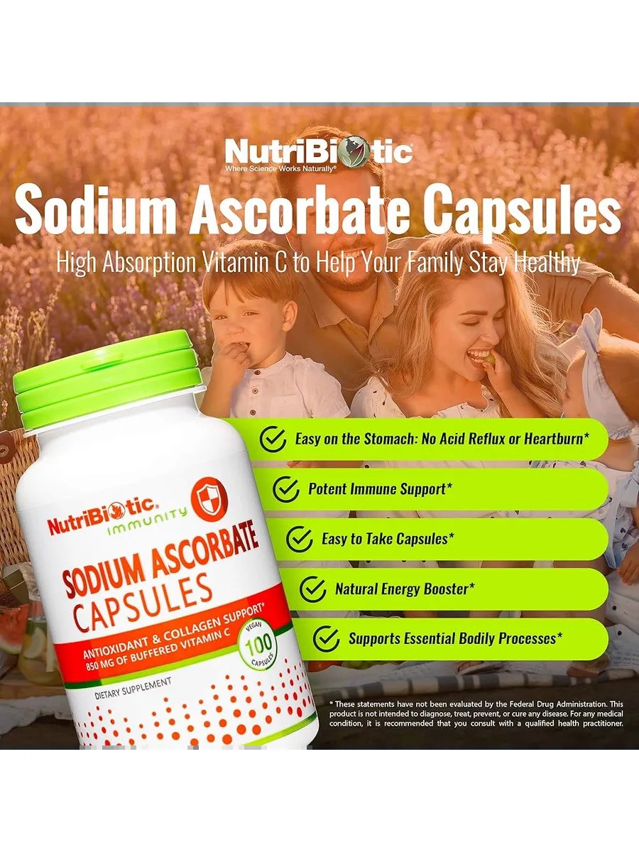 NutriBiotic - Sodium Ascorbate Buffered Vitamin C Capsules, 100 Ct | Vegan, Non-Acidic & Easier on Digestion Than Ascorbic Acid | Essential Immune Support & Antioxidant Supplement | Gluten & GMO Free