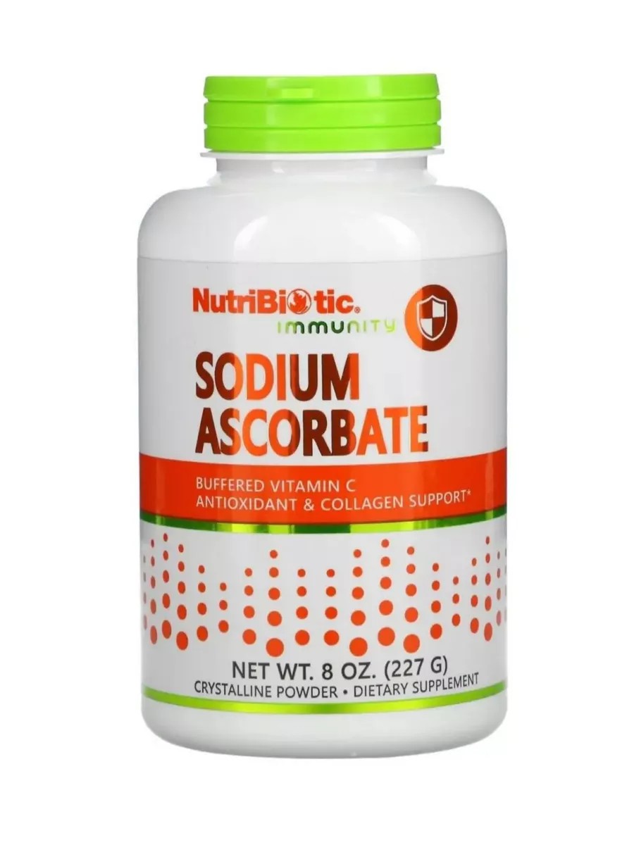 Хорошо растворимый аскорбат натрия NutriBiotic — это не имеющий горького привкуса, некислый буферный кристаллический порошок, содержащий 100%-ный витамин C (L-аскорбиновую кислоту) фармацевтической степени чистоты и натрий в хорошо растворимой форме.Витамин C и натрий являются важнейшими питательными веществами для организма. Витамин C обеспечивает антиоксидантную защиту иммунной системы, а также поддерживает здоровье кровеносных сосудов, тканей, хрящей, костей, глаз и других систем органов. Кроме того, он необходим для биосинтеза коллагена, L-карнитина и нейромедиаторов. Натрий — это электролит, помогающий поддерживать баланс воды в клетках и вокруг них, контролировать стабильное кровяное давление, а также имеющий важное значение для мышечной и нервной систем. Все это делает витамин C и натрий жизненно важными для поддержания здоровья всего организма. Каждая порция содержит 1100 мг витамина C и 120 мг натрия.Аскорбат натрия NutriBiotic производится путем растворения аскорбиновой кислоты в гидрокарбонате натрия (добытого из земли). Натрий в этом продукте отличается от обычной поваренной соли, так как он не сочетается с хлором. Аскорбат натрия NutriBiotic идеально подходит для людей, которым нужна щелочная (буферизованная) форма витамина C.Показатель кислотности или щелочности (нейтральный уровень pH — 7,0)Рекомендации по применениюВ качестве пищевой добавки развести 1/4 чайной ложки в стакане сока или воды. Принимать во время еды или натощак.