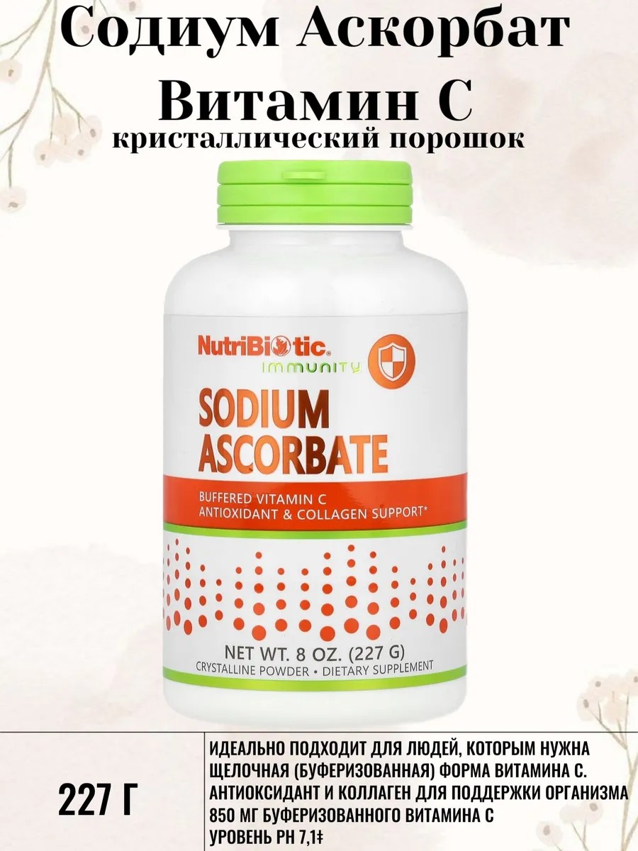 Содиум аскорбат— это не имеющий горького привкуса, некислый буферный кристаллический порошок, содержащий L-аскорбиновую кислоту фармацевтической степени чистоты и натрий в хорошо растворимой форме. Витамин C обеспечивает антиоксидантную защиту иммунной системы, а также поддерживает здоровье кровеносных сосудов, тканей, хрящей, костей, глаз и других систем органов. Каждая порция содержит 1100 мг витамина C и 120 мг натрия. Рекомендации по применению: В качестве пищевой добавки развести 1/4 чайной ложки в стакане сока или воды. Принимать во время еды или натощак.