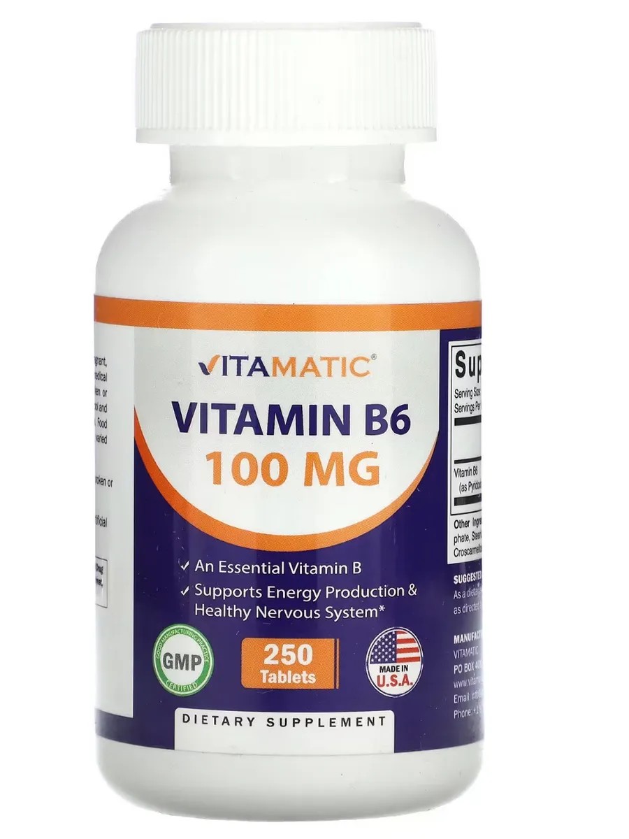 | Комплектация | Vitamatic Витамин B6 (пиридоксин гидрохлорид), 100 мг, 250 вегетарианских таблеток; бад сша 250 таблеток |