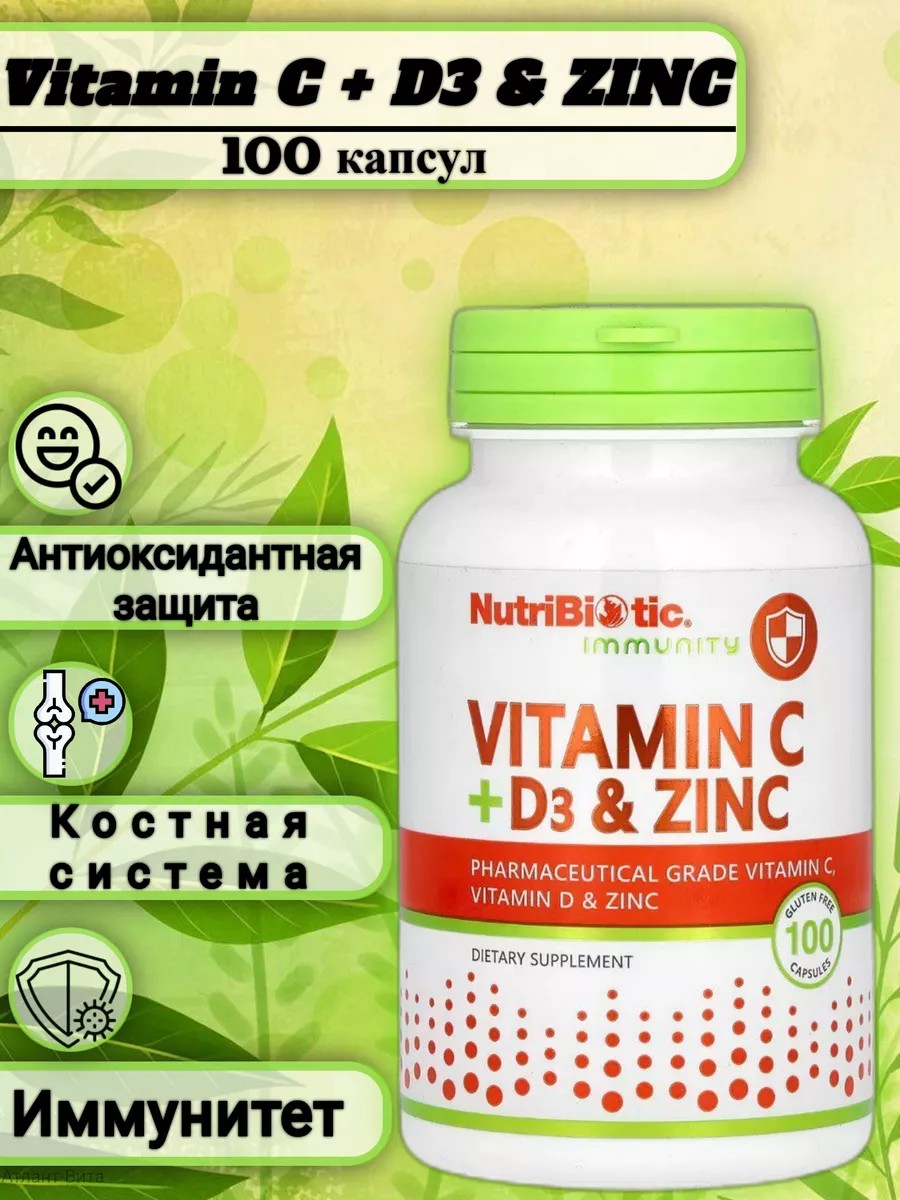 NutriBiotic Vitamin C,D3,Zinc ,Витамин C+Д3 & Цинк, 100 капсул
