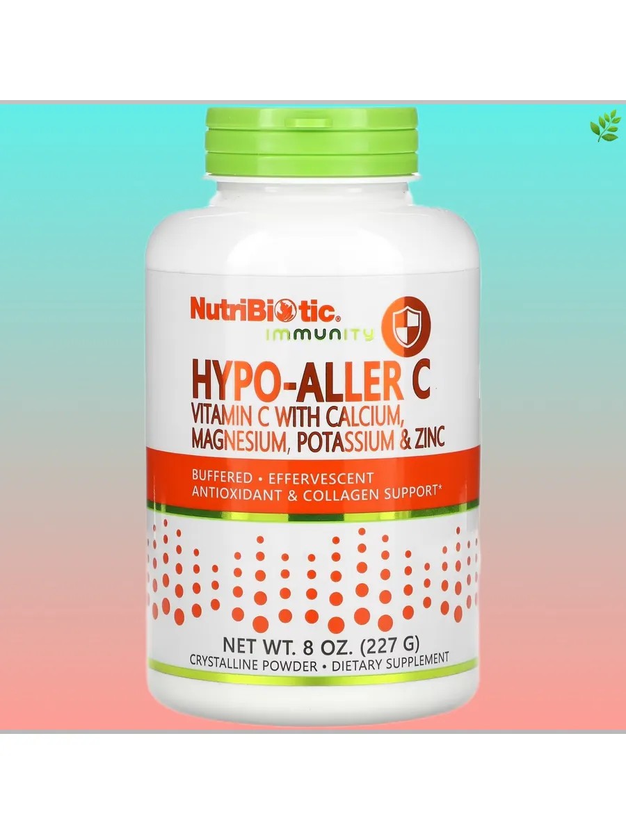 Hypo-AllerC от NutriBiotic— это шипучий порошок, содержащий 100% L-аскорбиновую кислоту (витаминC) фармацевтической степени чистоты и ряд минералов с высокой биодоступностью, в том числе кальций, магний, калий и цинк, в легко растворимой форме.