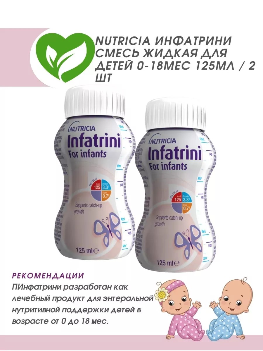 Инфатрини от компании Нутриция - это специализированный продукт детского диетического лечебного питания для детей раннего возраста, готовая к употреблению, высокобелковая, высококалорийная смесь “Инфатрини жидкий”. 1 мл = 1 ккал. Питание Nutricia Infatrini показан при состояниях, связанных с недостаточностью питания, задержке роста, повышенной потребности в энергии или ограничении по введению жидкости. “Инфатрини жидкий” это энергетически насыщенный, сбалансированный, готовый к употреблению продукт для энтерального питания детей с рождения до 18 месяцев или весом до 9 кг. Может использоваться как единственный источник питания. Не содержит глютен. Упаковано в защитной атмосфере. Противопоказан пациентам с галактоземией. Важно! ТОЛЬКО ДЛЯ ЭНТЕРАЛЬНОГО ПРИМЕНЕНИЯ. Для перорального и зондового питания. Принимать под наблюдением врача после рассмотрения всех вариантов кормления, включая грудное вскармливание. ИНСТРУКЦИЯ ПО ПРИМЕНЕНИЮ: Хорошо встряхните перед применением. Вымойте руки и простерилизуйте все принадлежности для кормления. Продукт может употребляться комнатной температуры или подогретым. После вскрытия закрытая бутылочка может храниться в холодильнике не более 12 часов. Если продукт употреблялся прямо из бутылочки, выбросьте остатки. Максимальное время кормления через зонд 4 часа. Хранить в сухом месте при температуре 5-25°C.