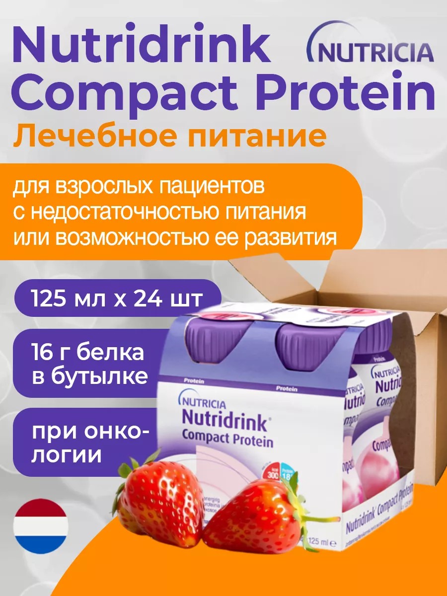 Нутридринк Протеин Компакт, со вкусом клубники – жидкая, готовая к употреблению, высокобелковая, высококалорийная смесь в пластиковой бутылке. Предназначается для взрослых пациентов с недостаточностью питания или с риском ее развития.