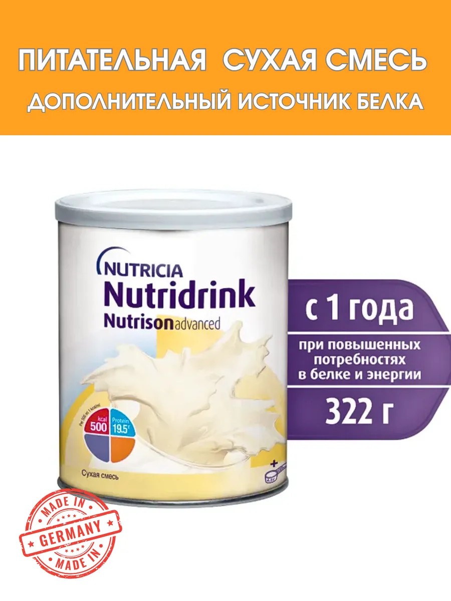 Nutridrink Nutrison Advanced, in a metal can, is a dry mixture for dietary therapeutic nutrition to meet the specific protein and energy needs of patients during treatment and rehabilitation. It is intended for enteral nutrition of patients capable of eating independently during rehabilitation after a stroke and other critical conditions, as well as during the preparation and recovery period after surgery. The mixture does not contain gluten, dietary fiber, or genetically modified components. It can be consumed orally, as a drink, or through a feeding tube. Release form: 322 g of dry powder in a metal can with a membrane and an outer closing lid - a measuring spoon for 4.3 g in each can.