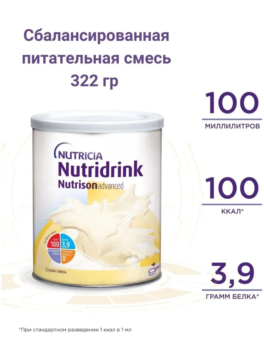 Nutridrink Nutrison Advanced in a metal can is a dry mixture for dietary therapeutic nutrition designed to meet the specific protein and energy needs of patients during treatment and rehabilitation. It is available in two dilution levels (hyper- and isocaloric). It is intended for enteral nutrition of patients capable of eating independently during rehabilitation after a stroke and other critical conditions, as well as during the preparation and recovery period after surgery. Two dilution levels fully meet the individual needs of each patient and ensure their body receives a complete vitamin and mineral composition, enriched with carotenoids and high levels of potassium, iron, manganese, copper, selenium, iodine, and chromium. The mixture does not contain gluten, dietary fiber, or genetically modified components. It can be consumed orally, as a drink, or through a feeding tube. Release form: 322 g of dry powder in a metal jar with a membrane and an outer closing lid - a measuring spoon for 4.3 g in each jar. Indications for use: - post-stroke condition and rehabilitation period - recovery from critical conditions - before and after surgery - gastrointestinal tract lesions: radiation enteritis, chemotherapy, cholecystitis, pancreatitis, fistulas, cystic fibrosis - partial mechanical obstruction of food passage: impaired swallowing and chewing, tumors and injuries of the head and neck, strictures and obstructions of various parts of the gastrointestinal tract - conditions associated with loss of appetite and / or refusal to eat: cancer, neurological diseases, mental disorders, liver disease, cardiopulmonary insufficiency, AIDS, stress - malnutrition of any etiology. Contraindications for use: - age under 1 year - galactosemia - individual intolerance to the components of the mixture. Technical characteristics (nutritional value per 100 g of dilution): - main characteristics per 100 g: energy value 1943 kJ / 463 kcal; protein (16% of energy) 18.2 g; fat (35% of energy) 18.2 g, saturated 8.5 g; carbohydrates (49% of energy) 56.6 g, sugars 8.7 g, lactose 0.14 - main characteristics per 100 ml: energy value 420 kJ / 100 kcal; protein (16% of energy) 3.9 g; fat (35% of energy) 3.9 g, saturated 1.8 g; carbohydrates (49% of energy) 12.2 g, sugars 1.9 g, lactose 0.03; Osmolarity 320 m0 cm/l. Storage conditions: - in a dry place at a temperature of +5 to +25 °C. Do not refrigerate. - Store the opened package tightly closed in a cool, dry place. Use within one month. Nutridrink Nutrizon / Nutrizon Advance / Nutridrink Advance / enteral nutrition / therapeutic nutrition / supplementary nutrition.
