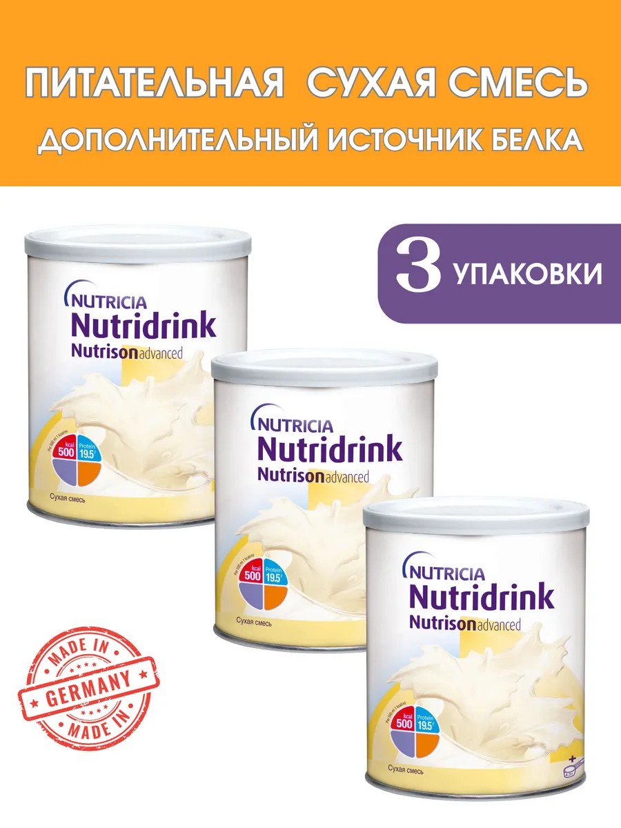 Nutridrink Nutrison Advanced, in a metal can, is a dry mixture for dietary therapeutic nutrition to meet the specific protein and energy needs of patients during treatment and rehabilitation. It is intended for enteral nutrition of patients capable of eating independently during rehabilitation after a stroke and other critical conditions, as well as during the preparation and recovery period after surgery. The mixture does not contain gluten, dietary fiber, or genetically modified components. It can be consumed orally, as a drink, or through a feeding tube. Release form: 322 g of dry powder in a metal can with a membrane and an outer closing lid - a measuring spoon for 4.3 g in each can.