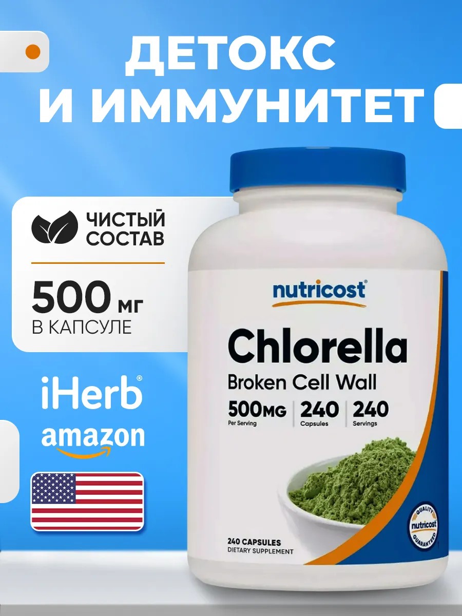 NUTRICOST Chlorella (500 мг) — это добавка на основе одноклеточной зелёной водоросли хлореллы, богатой питательными веществами, хлорофиллом и антиоксидантами. Она известна своими детоксикационными и иммуномодулирующими свойствами. Вот её ключевые функции и польза: