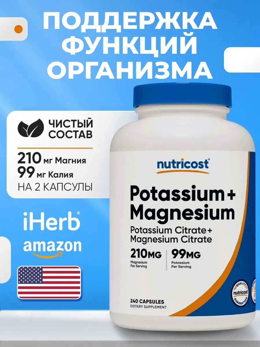 NUTRICOST Potassium (99 mg) Magnesium (210 mg) Citrates, 240 Capsules — это комбинированная добавка, содержащая калий и магний в форме цитратов. Эти минералы играют ключевую роль в поддержании многих функций организма. Вот подробный разбор её назначения и полезных свойств: