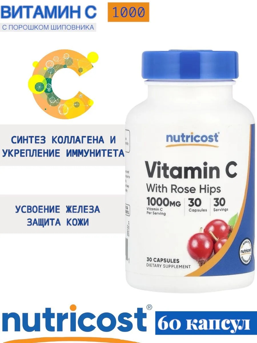 Nutricost Витамин C с шиповником, 30 капсул