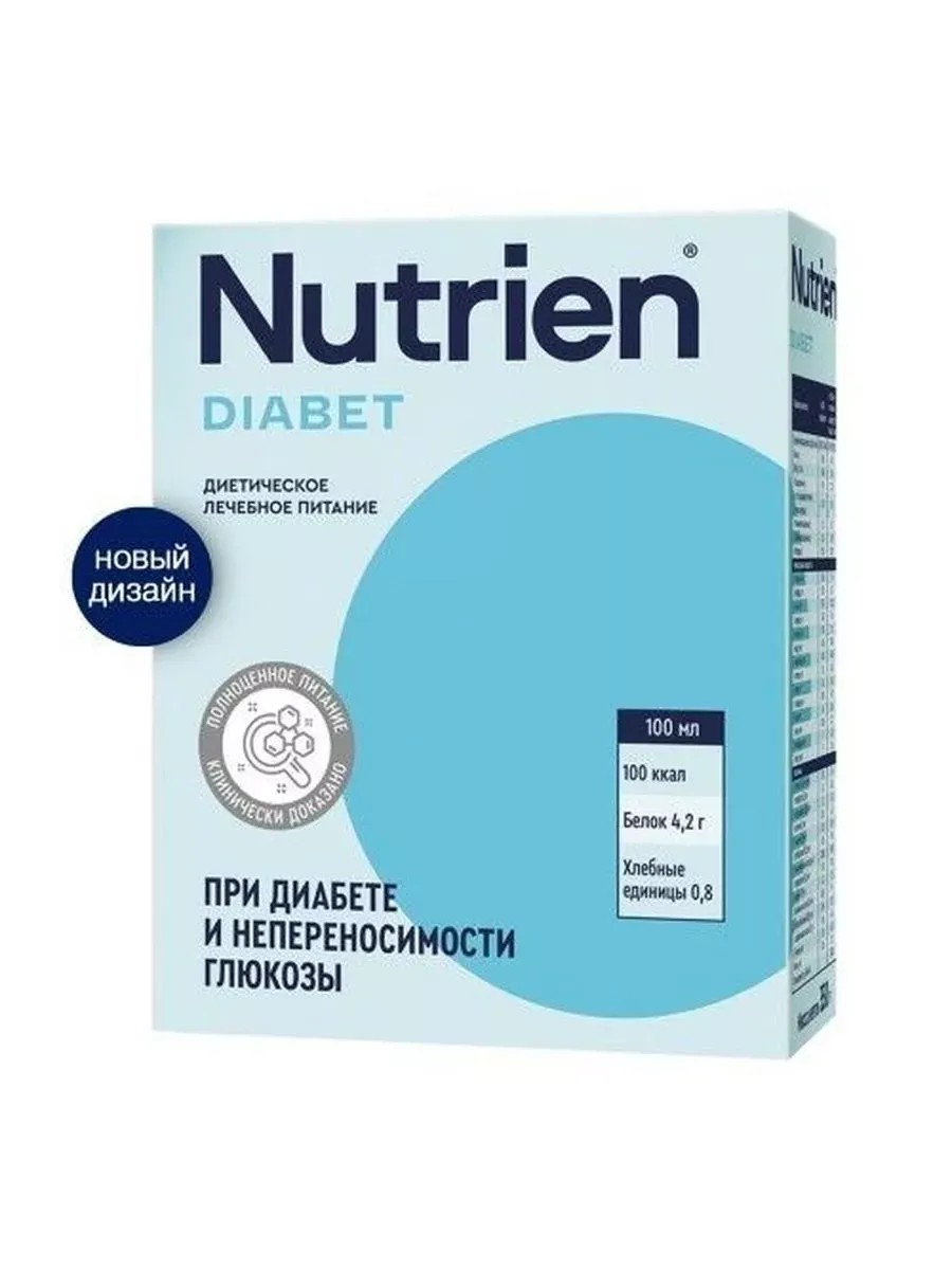 НУТРИЭН ДИАБЕТ С НЕЙТРАЛЬНЫМ ВКУСОМ 320,0Nutrien Diabet (Нутриэн Диабет) 320г - Полноценный специализированный продукт для диетического лечебного (энтерального) питания при сахарном диабете 1 и 2 типа, с ограниченной переносимостью глюкозы и стрессиндуцированной гипергликемией, а также с различными заболеваниями, включая критические состояния. Может быть назначен пациентам с проблемами ЖКТ для нормализации микробиоты и моторики кишечника.Состав Nutrien Diabet полностью сбалансирован: в него входят витамины, питательные вещества и микроэлементы, которые нужны для нормального самочувствия и жизнедеятельности.Ключевые особенности:Белки представлены нативным молочным белком, который легко усваивается и обладает высокой биологической ценностью и биодоступностью. Белковый компонент сбалансирован профилем аминокислот, предотвращающим развитие белковой недостаточности и диабетической ангиопатии.Среднецепочечные триглицериды повышают усвояемость смеси в желудочно-кишечном тракте.Углеводный компонент не содержит дисахаров и инсулинозависимых моносахаров. Соотношение углеводных компонентов (фруктоза и мальтодекстрин) обеспечивает снижение гликемической нагрузки у больных диабетом, не вызывает резкого и быстрого повышения уровня глюкозы в крови, фруктоза не требует инсулин для усвоения.Пищевые волокна нормализуют процессы пищеварения, замедляют скорость всасывания углеводов в пищеварительном тракте, сокращают частоту эпизодов диареи и запоров.Оптимальное соотношение ПНЖК (Омега 6, Омега 3 жирные кислоты), витаминно-минеральный комплекс обеспечивают выраженный антиоксидантный и иммуномодулирующий эффект.Глигемический индекс 18,7.Пищевая ценностьв 100 г продукта в 100 мл готового продукта1 ккал/1млЭнергетическая ценность, кДж/ккал 2006/479 419/100Белок, г 20,0 4,2Жир, г 26,0 5,4линолевая кислота 4,9 1,2альфа -линоленовая кислота 1,0 0,25Углеводы, г, в т.ч. 37,8 7,9фруктоза, г 6,0 1,3Пищевые волокна, г 7,0 1,5Минеральные вещества:кальций, мг 345 72фосфор, мг 345 72калий, мг 6