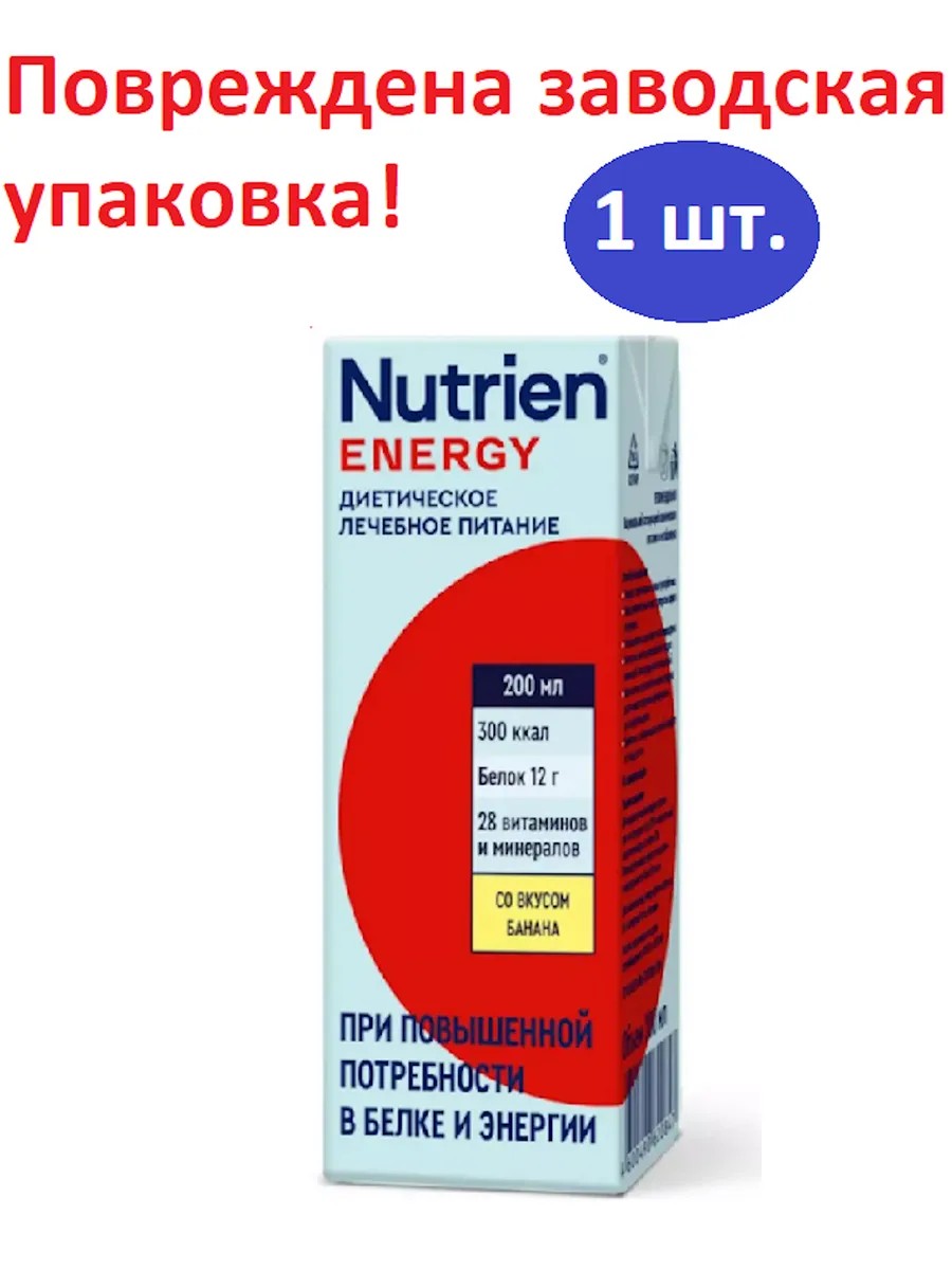 Nutrien Energy (Нутриэн Энергия) со вкусом банана, лечебное энтеральное питание 200 млNutrien Energy (Нутриэн Энергия) 200 мл - полноценный специализированный продукт для диетического лечебного (энтерального) питания для пациентов с высокими потребностями в белке и энергии при различных заболеваниях, включая критические состояния. Для профилактики и устранения недостаточности питания, а также коррекции состава рациона питания. Жидкая готовая смесь со вкусом банан объемом 200 мл в упаковке Tetra Pak, в комплекте с одноразовой трубочкой. Ключевые особенности: Повышенное содержание белка и энергии Жиры состоят на 50% из среднецепочечных трилицеридов, что способствует быстрому усвоению энергии, даже в условиях ферментативной недостаточности (отсутствие или дефицит липазы).