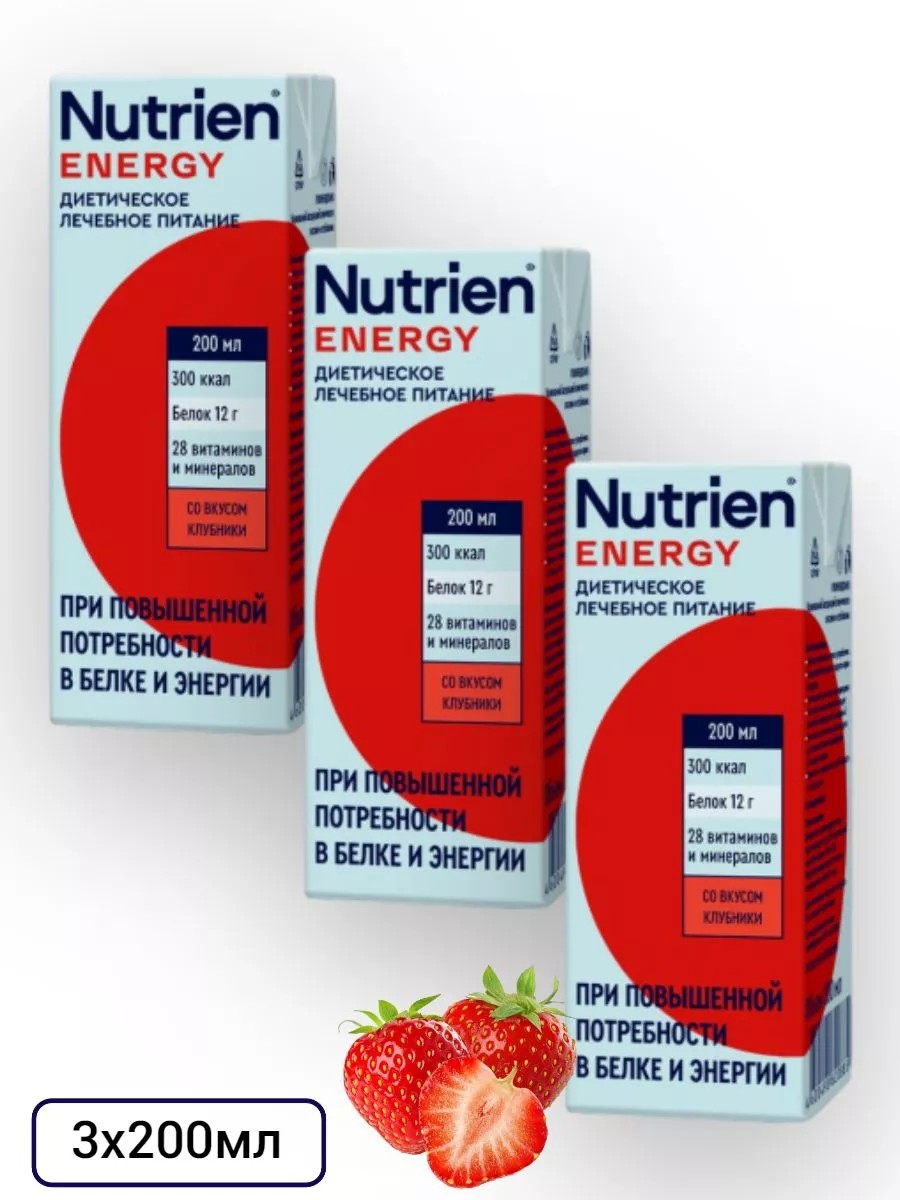 Nutrien Energy (Нутриэн Энергия) со вкусом клубники 200 мл - полноценный специализированный продукт для диетического лечебного (энтерального) питания для пациентов с высокими потребностями в белке и энергии при различных заболеваниях, включая критические состояния. Для профилактики и устранения недостаточности питания, а также коррекции состава рациона питания.