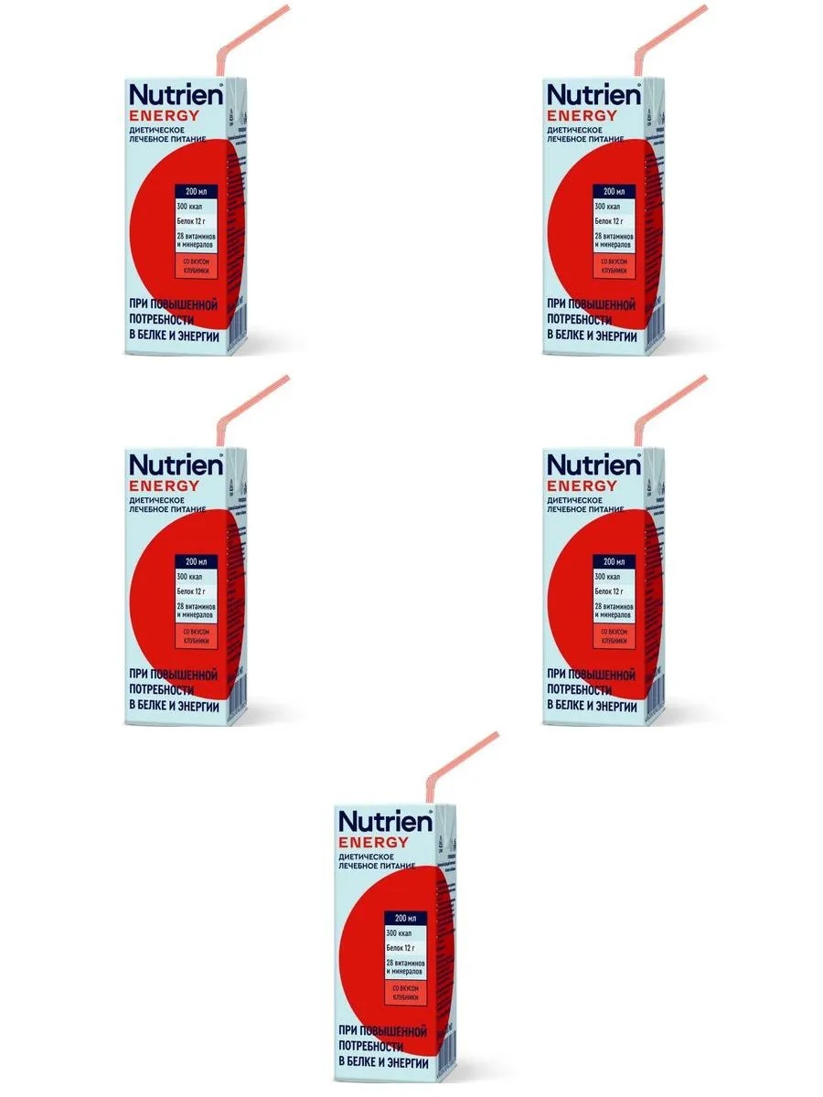 нутриэн энергия со вкусом клубники 200мл. омега 3 жирные кислоты – оказывают противовоспалительный и иммуностимулирующий эффект, биологически ценный белок – корректирует питательную недостаточность стерилизованный специализированный продукт для диетического (лечебного) питания детей старше 3-х лет и взрослых с повышенными потребностями в энергии и белке при различных заболеваниях, когда обычный прием и/или усвоение пищи невозможны, ограничены или недостаточны вода, мальтодекстрин, молочный белок, среднецепочечные триглицериды, растительные масла (низкоэруковое рапсовое, соевое), сахар, минеральные вещества (цитрат , цитрат магния, фосфат калия, цитрат калия, калия, , сульфат железа, сульфат цинка, марганца, сульфат меди, фторид , хрома, йодид калия, молибдат аммония, селенит ,), эмульгатор (моно-и диглицериды жирных кислот), рыбий жир (источник эйкозапентаеновой epa и докозагексаеновой dha кислот), витаминный комплекс (аскорбиновая кислота, токоферола ацетат, никотинамид, d-пантотенат кальция, пиридоксина гидро, рибофлавин, тиамина гидро, ретинола ацетат, фолиевая кислота, филлохинон, d-биотин, холекальциферол, цианокобаламин), холина битартрат, антиокислитель (l-аскорбилпальмитат) nutrien energy (нутриэн энергия) со вкусом клубники, лечебное (энтеральное) питание.nutrien energy (нутриэн энергия) со вкусом клубники 200 мл - полноценный специализированный продукт для диетического лечебного (энтерального) питания для пациентов с высокими потребностями в белке и энергии при различных заболеваниях, включая критические состояния. для профилактики и устранения недостаточности питания, а также коррекции состава рациона питания.ключевые особенности:повышенное содержание белка и энергиижиры состоят на 50% из среднецепочечных трилицеридов, что способствует быстрому усвоению энергии, даже в условиях ферментативной недостаточности (отсутствие или дефицит липазы).белки представлены нативным молочным белком, который