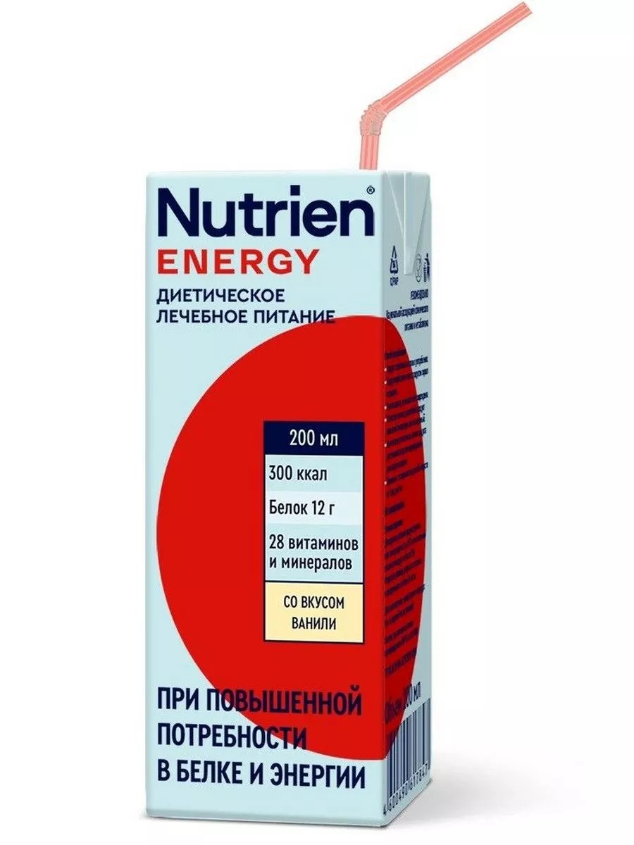 НУТРИЭН ЭНЕРГИЯ СО ВКУСОМ ВАНИЛИ 200МЛNutrien Energy (Нутриэн Энергия) со вкусом ванили, лечебное (энтеральное) питание.Nutrien Energy (Нутриэн Энергия) со вкусом ванили 200 мл - полноценный специализированный продукт для диетического лечебного (энтерального) питания для пациентов с высокими потребностями в белке и энергии при различных заболеваниях, включая критические состояния. Для профилактики и устранения недостаточности питания, а также коррекции состава рациона питания.Ключевые особенности:Повышенное содержание белка и энергииЖиры состоят на 50% из среднецепочечных трилицеридов, что способствует быстрому усвоению энергии, даже в условиях ферментативной недостаточности (отсутствие или дефицит липазы).Белки представлены нативным молочным белком, который легко усваивается и обладает высокой биологической ценностью и биодоступностью.Оптимальное соотношение ПНЖК (Омега 6, Омега 3 жирные кислоты), витаминно-минеральный комплекс обеспечивают выраженный антиоксидантный и иммуномодулирующий эффект.Хорошая органолептика (не приторные, низкая вязкость) способствует высокой приверженности к диетотерапии.Специальные особенности:Не содержит глютен, лактозу и холестерин в клинически значимых количествахНе содержит искусственных красителей и ароматизаторов.Пищевая ценность в 100 мл(1,5 ккал/мл)Энергетическая ценность, кДж/ккал 628/150Белки (16% ккал), г 6,0Жиры (35% ккал), г, в т. ч. 5,9Насыщенные, г 3,2в т.ч. среднецепочечные триглицериды, г 2,8Мононенасыщенные, г 1,4Полиненасыщенные, г 1,3омега-3 жирные кислоты, г, в т.ч. 0,32эйкозапентаеновая кислота, мг 20докозагексаеновая кислота, мг 12Углеводы (49% ккал), г 18,2в т.ч. сахароза, г 0,5Минеральные вещества:калий, мг 190натрий, мг 120кальций, мг 112фосфор, мг 97магний, мг 30железо, мг 1,6марганец, мкг 300медь, мкг 152цинк, мг 1,5хлориды, мг 100йод, мкг 20хром, мкг 7,6молибден, мкг 12селен, мкг 8,0фтор, мг 0,15Витамины:ретинол (А), мкг-экв 120кальциферол (Д), мкг 1,5токоферол (Е), мг 2,0витамин К, мкг 8,5аскорбиновая кислота (С), мг 15пантотеновая кислота, мг 0,7тиамин (В1), мкг 150рибофлавин (В2), мкг 210ниацин (РР), мг 1,9пиридоксин (В6), мкг 240цианкобаламин (В12), мкг 0,29фолиевая кислота, мкг 38биотин, мкг 7Холин, мг 45Осмолярность, мОсм/л 39000