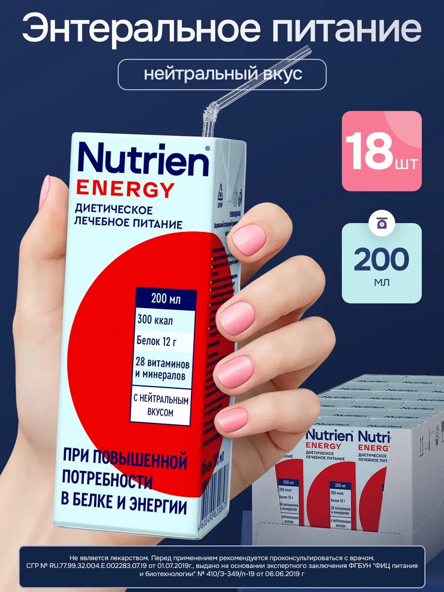 Nutrien Energy содержит все основные необходимые для поддержания жизни человека питательные вещества, витамины и минералы. Форма выпуска - жидкая готовая смесь с нейтральным вкусом объемом 200 мл в упаковке Tetra Pak, в комплекте с одноразовой трубочкой.