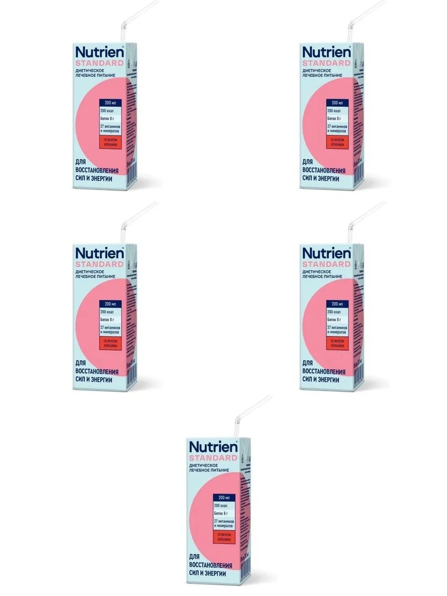 Nutrien Standard with strawberry flavor 200 ml. the ratio of non-protein calories to nitrogen of 1.0:134 allows for optimal utilization of protein as a plastic material the ratio of w6:w3 4.2:1 has an anti-inflammatory and immunostimulating effect 50% of stg promotes easy absorption for dietary nutrition of children from 3 years old and adults to restore strength and energy, including: • in case of nutritional deficiency, cachexia • in the pre- and postoperative periods • in cancer, during chemotherapy and radiation therapy • in case of damage to the maxillofacial region in case of dysfunction of the gastrointestinal tract water, maltodextrin, milk protein concentrate, medium-chain triglycerides, vegetable oils (soybean, low-erucic rapeseed), minerals (magnesium, potassium phosphate, potassium citrate, calcium carbonate, calcium phosphate, citrate, iron sulfate, zinc sulfate, copper sulfate, manganese, Potassium iodide, chromium, selenite, ammonium molybdate), sugar, flavoring, vitamins (ascorbic acid, nicotinamide, tocopherol acetate, calcium pantothenate, pyridoxine hydro, thiamine hydro, riboflavin, retinol acetate, folic acid, d-biotin, phylloquinone, cyanocobalamin, cholecalciferol), choline bitartrate, inositol, l-carnitine, taurine, emulsifier (lecithin), antioxidant (ascorbyl palmitate).
