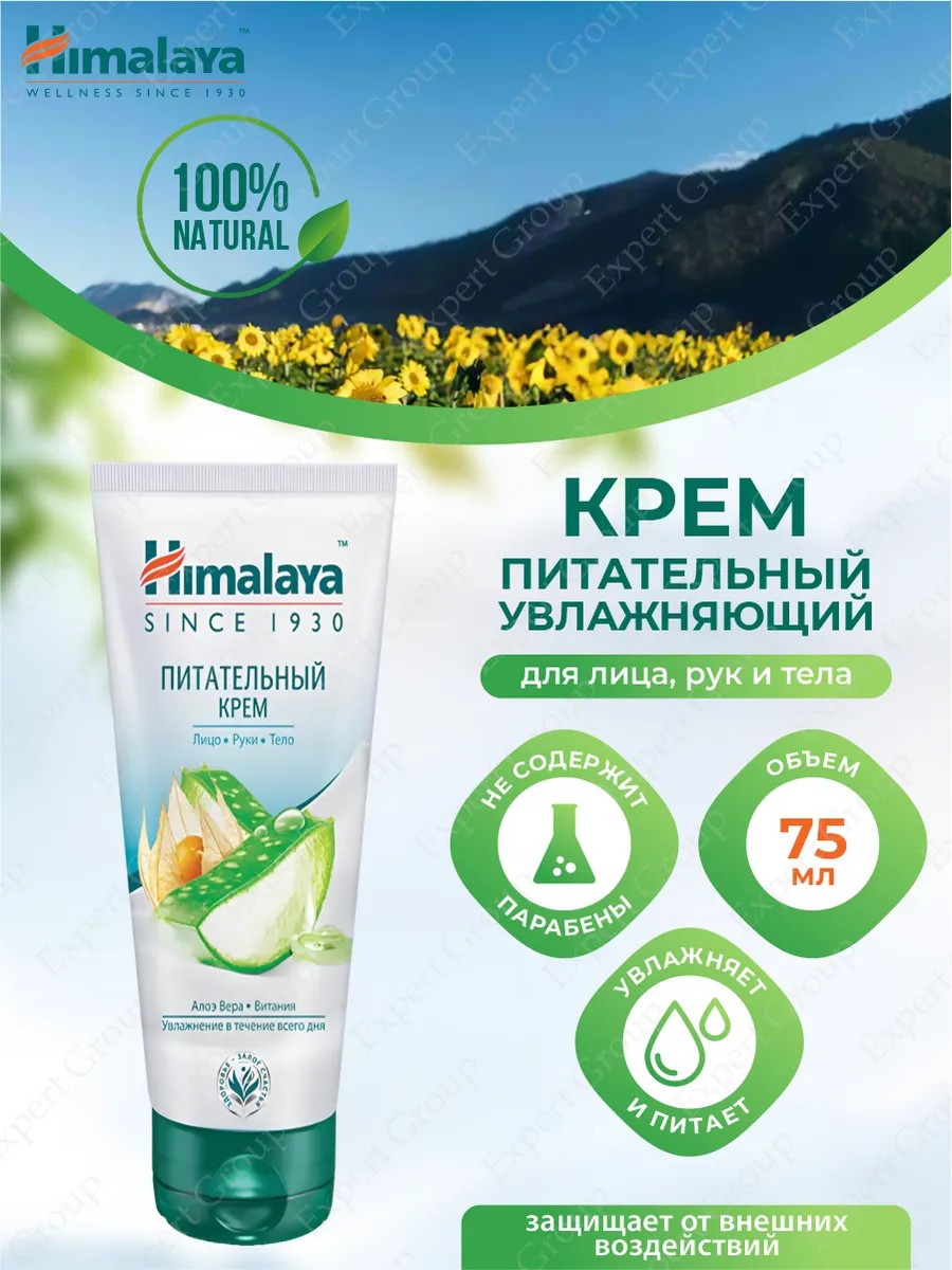 Питательный крем для лица, рук и тела Himalaya 75 мл. Активные ингредиенты: Алоэ Вера питает и увлажняет кожу. Витания, Птерокарпус и Центелла Азиатская защищают кожу от вредного воздействия окружающей среды и обезвоживания. Интенсивно питает кожу рук, обладает увлажняющим и смягчающим действиями в течение длительного времени, защищает нежную кожу рук и контролирует уровень влаги. Отсутствие эффекта пленки.