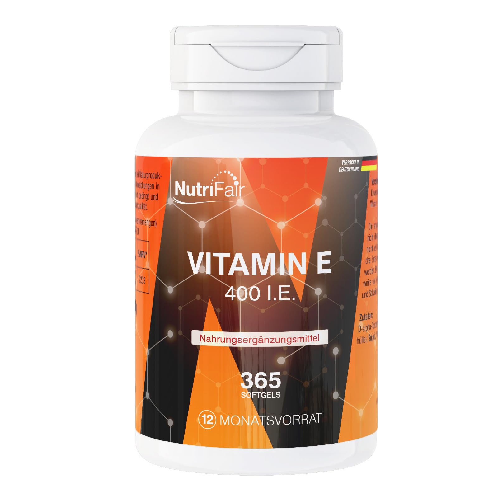 Vitamin E 400 I.E. from NutriFair Vitamin E – fat-soluble vitamin with antioxidant activity. Vitamin E is a fat-soluble vitamin used as a collective name for various tocopherols and tocotrienols. The softgels reliably protect the oil against light and oxygen, which promotes the stability of the raw material. Vitamin E contributes to the protection of cells against oxidative stress. Contents: 365 softgels Recommended use: adults 1 softgel daily with a meal and plenty of water. A softgel contains NRV : Vitamin E 268 mg (400 I.E.) 2233 Ingredients: D-alpha-tocopheryl acetate, coating agent gelatin (beef capsule shell), soy oil, humectant glycerin (capsule shell) INGREDIENTS D-alpha-Tocopheryl acetate, glazing agent gelatin (beef cg), soya oil, humectant glycerine (cg)MADE IN GERMANY: Our products are produced in Germany according to the highest German quality standards according to HACCP and tested and certified by independent German laboratories. The raw materials come from EU and non-EU countries. As a family business, we stand for integrity, transparency and the highest product quality. PRACTICAL DOSING CAP: The innovative closure allows you to dose the product with one hand movement. Long shelf life in airtight container with practical dosing lid and freshness seal. Ideal for on the go! WITHOUT UNWANTED ADDITIVES: Free from gluten, lactose, fructose, magnesium stearate, silicon dioxide, preservatives, soy, yeast, pesticides, fungicides, fertilizers, dyes, stabilizers and genetic engineering (NON-GMO). COMPLETE DAILY SUPPLY: Each softgel contains 268 mg (400 IU) of vitamin E – which is more than the daily requirement (NRV). 365 high-dose softgels to stock up!. THE CELL PROTECTIVE VITAMIN: Vitamin E is a fat-soluble vitamin with an antioxidant effect. Vitamin E contributes to the protection of cells against oxidative stress.Vitamine E 400 I.E. - 365 softgels met elk 268mg vitamine E - Hoge dosering - D-alfa-tocoferylacetaat – Duitse productie laboratoriumtest - NutriFair Premium Fair Vitamine E 400 I.E. van NutriFair Vitamine E – in vet oplosbare vitamine met antioxiderende werking. Vitamine E is een in vet oplosbare vitamine die wordt gebruikt als verzamelnaam voor verschillende tocoferolen en tocotrienolen. De softgels beschermen de olie op betrouwbare wijze tegen licht en zuurstof, wat de stabiliteit van de grondstof bevordert. Vitamine E draagt bij aan de bescherming van de cellen tegen oxidatieve stress. Inhoud: 365 softgels Aanbevolen gebruik: volwassenen dagelijks 1 softgel bij een maaltijd met veel water. Een softgel bevat NRV : Vitamine E 268 mg (400 I.E.) 2233 Ingrediënten: D-alfa-tocoferylacetaat, coatingmiddel gelatine (rund capsulehuls), sojaolie, bevochtigingsmiddel glycerine (capsulehuls) INGREDIËNTEN D-alfa-Tocoferylacetaat, glansmiddel gelatine (rund omhulsel), sojaolie, bevochtigingsmiddel glycerine (omhulsel)GEPRODUCEERD IN DUITSLAND: Onze producten worden volgens de hoogste Duitse kwaliteitsnormen in Duitsland geproduceerd volgens HACCP en getest en gecertificeerd door onafhankelijke Duitse laboratoria. De grondstoffen zijn afkomstig uit EU- en niet-EU-landen. Als familiebedrijf staan wij voor integriteit, transparantie en de hoogste productkwaliteit. PRAKTISCHE DOSERINGSDOP: Dankzij de innovatieve sluiting kunt u het product met één handbeweging doseren. Lange houdbaarheid in luchtdicht afgesloten blik met praktische doseerdeksel en versheidssegel. Ideaal voor onderweg!. ZONDER ONGEWENSTE TOEVOEGINGEN: Vrij van gluten, lactose, fructose, magnesiumstearaat, siliciumdioxide, conserveermiddelen, soja, gist, pesticiden, fungiciden, kunstmest, kleurstoffen, stabilisatoren en genetische manipulatie (NON-GMO). VOLLEDIGE DAGELIJKSE VOORZIENING: Elke softgel bevat 268 mg (400 I.E.) vitamine E – dat is meer dan de dagelijkse behoefte (NRV). 365 softgels met een hoge dosering om een voorraad aan te leggen!. DE CELBESCHERMENDE VITAMINE: Vitamine E is een in vet oplosbare vitamine met een antioxiderende werking. Vitamine E draagt bij aan de bescherming van de cellen tegen oxidatieve stress.