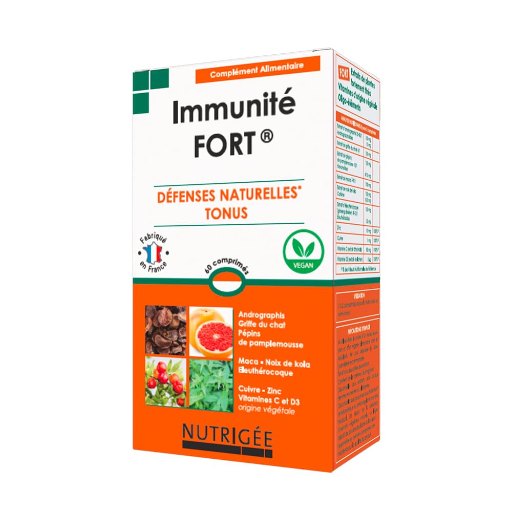 : Your immune system deserves the best. Immunity Fort was designed to meet a fundamental need: naturally strengthening the body's defenses. Its comprehensive formula combines powerful plant extracts such as cat's claw, andrographis, and grapefruit seed extract with essential vitamins and minerals like natural vitamin C from acerola, vitamin D3, zinc, and copper. Together, these elements work synergistically to help the body defend itself effectively against external threats. But this supplement goes far beyond immunity. Thanks to renowned tonic plants like maca, kola nut, and eleutherococcus, Immunity Fort also supports your energy levels and actively combats physical and mental fatigue. Whether you're experiencing stress, feeling run down, or seeking overall support during a change of season, this formula provides a boost of vitality, increased resistance, and true everyday comfort. A must-have for anyone wanting to stay at their best and in good shape all year round. Quality, natural ingredients, and effectiveness: it has it all. Made in France according to the strictest standards, Immunity Fort is guaranteed GMO-free, preservative-free, and colorant-free. Each tablet is precisely dosed to ensure an effective 30- to 60-day course, depending on your needs. Easy to integrate into your routine, this highly concentrated nutritional supplement is an ideal solution to naturally support your immunity, maintain your energy levels, and prevent imbalances related to a modern lifestyle. Ingredients: Acerola extract concentrate 18-20 1 (standardized to 25 natural vitamin C), Andrographis extract concentrate 20 1 (standardized to 10 andrographolides), Cat's claw extract concentrate 4 1 (standardized to 3 alkaloids), Grapefruit seed extract concentrate 4 1 (standardized to 45 flavonoids), Maca extract concentrate 7-9 1, Kola nut extract concentrate 1-2 1 (standardized to 11 natural caffeine), Eleutherococcus extract concentrate 8-12 1 (standardized to 0.8-2 eleutherosides), Zinc oxide, Copper sulfate, Lichen extract (natural vitamin D3).