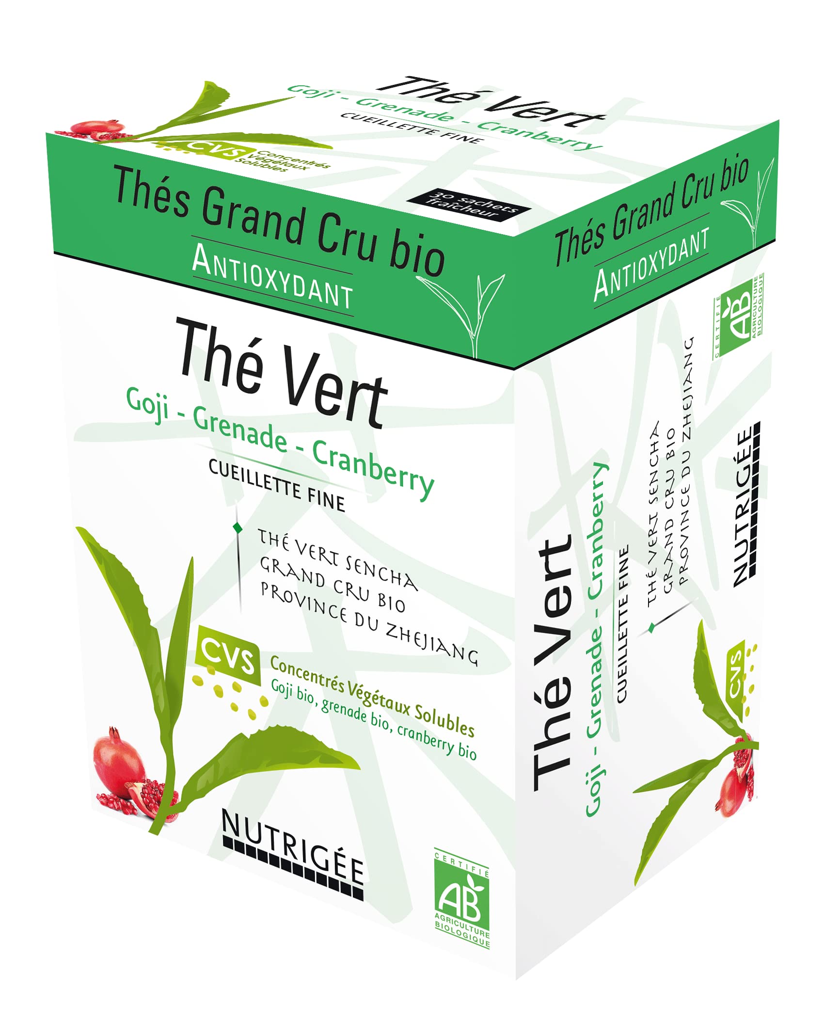 Sencha Green Tea from the Chinese province of Zheijiang is rich in polyphenols, particularly EGCG. Fine picking ensures a high content of active ingredients. FINE PICKING The picking of our organic Grand Cru Teas is limited to the bud and the first two leaves: Imperial Picking or Fine Picking. It is carried out in spring when the sap rises. These young shoots concentrate 80 of the antioxidants in tea. Freshness bag: the hermetically sealed freshness bag guarantees all the flavors and virtues of the grand cru organic herbal teas packaged in unbleached paper bags, without staples and without glue. Preparation: to obtain the full flavors of this strong organic infusion, use quality water. Let the bag infuse for 3 to 5 minutes. It is recommended to drink, hot or cold, 2 to 4 cups per day. 1 sachet 2 cups. Product from Organic Farming. Protect from heat and humidity. To be used in addition to a balanced and varied diet which, alone, ensures a good nutritional balance INGREDIENTS Organic Sencha green tea, organic soluble vegetable fiber granules (organic agave inulin and organic chicory extract, 4 1 concentrated organic extracts of goji, pomegranate and cranberry, natural flavor, organic blackcurrant and blueberry berries). DIRECTIONS FOR USE To prepare this strong organic infusion, use quality water. Infuse the sachet for between 3 and 5 minutes. It is recommended to drink, hot or cold, 2 to 4 cups per day. 1 sachet 2 cups. THE NUTRIGÉE COMMITMENT: Organic Grand Cru Teas are hand-harvested in small, high-altitude gardens and renowned for their ancestral virtues. Certified ORGANIC ingredients have been rigorously selected to ensure quality and traceability. Freshness bags guarantee the integrity and virtues of our products. Tea bags made from chlorine-free paper, staple-free and glue-free. Suitable for vegetarians and vegans. NUTRIGÉE ADVICE: For even greater effectiveness, combine your tea with our STRONG ANTI-OXIDANT food supplement. CVS PROCESS: This process encapsulates and protects the essential oils in organic plant fiber granules, which release all the active ingredients of the plants when dissolved. Soluble Plant Concentrates, with their concentration of active ingredients, reinforce the action of Nutrigée organic Grand Cru Teas. ANTI-ANTIOXIDANTS ORGANIC GOJI: very rich in polyphenols LPB polysaccharides ORGANIC POMEGRANATE: ellagic acid ORGANIC CRANBERRY: proanthocyanidins. SENCHA GREEN TEA rich in polyphenols, particularly EGCG. The fine picking ensures a high content of active ingredients. Thé Vert Sencha de la province chinoise du Zheijiang est riche en polyphénols notamment en EGCG. La cueillette fine assure une teneur élevée en principes actifs. CUEILLETTE FINE La cueillette de nos Thés Grand Cru bio se limite au bourgeon et aux deux premières feuilles : Cueillette Impériale ou Cueillette Fine. Elle s'effectue au printemps lors de la montée de la sève. Ces jeunes pousses concentrent 80 des antioxydants du thé. Sachet fraîcheur : le sachet fraîcheur scellé hermétiquement garantit l'intégralité des saveurs et des vertus des thés grand cru bio plantes conditionnées dans des infusettes en papier non blanchi au chlore, sans agrafe et sans colle. Préparation: pour obtenir les pleines saveurs de cette infusion forte bio, utiliser une eau de qualité. Laisser infuser le sachet entre 3 et 5 minutes. Il est conseillé de boire, chaud ou froid, de 2 à 4 tasses par jour. 1 sachet 2 tasses. Produit issu de l'Agriculture Biologique. A préserver de la chaleur et de l'humidité. A utiliser en complément d'un régime alimentaire équilibré et varié qui, seul, assure un bon équilibre nutritionnel INGRÉDIENTS Thé vert Sencha bio, granulés de fibres végétales solubles bio (inuline d'agave bio et extrait de chicorée bio, extraits bio concentrés 4 1 de goji, grenade et cranberry, arôme naturel, baies bio de cassis et de myrtille). MODE D'EMPLOI Pour préparer cette infusion forte bio, utiliser une eau de qualité. Faire infuser le sachet entre 3 et 5 minutes. Il est conseillé de boire, chaud ou froid, de 2 à 4 tasses par jour. 1 sachet 2 tasses. L'ENGAGEMENT NUTRIGÉE : Les Thés Grand Cru bio sont récoltés à la main dans des petits jardins d'altitude et reconnus pour leurs vertus ancestrales. Les ingrédients certifiés BIOLOGIQUES ont été sélectionnés de manière rigoureuse afin de garantir qualité et traçabilité. Les sachets fraîcheur garantissent l'intégrité et les vertus de nos produits. Infusettes en papier non blanchi au chlore, sans agrafe et sans colle.Convient aux végétariens et aux vegans. LE CONSEIL NUTRIGÉE : Pour encore plus d'efficacité, associez votre thé à notre complément alimentaire ANTI-OXYDANT FORT. PROCÉDÉ CVS : Ce procédé encapsule et protège les huiles essentielles dans des granules de fibres végétales biologiques qui restituent à leur dissolution l'ensemble des principes actifs des plantes. Les Concentrés Végétaux Solubles, par leur concentration en principes actifs, renforcent l'action des Thés Grands Crus bio Nutrigée. ANTI-ANTIOXYDANTS GOJI BIO : très riches en polyphénols polysaccharides LPB GRENADE BIO : acide ellagique CRANBERRY BIO : proanthocyanidines. THÉ VERT SENCHA riche en polyphénols notamment en EGCG. La cueillette fine assure une teneur élevée en principes actifs.