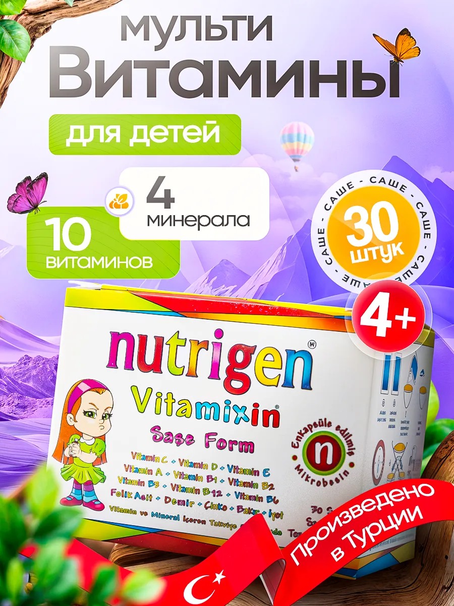 Представляем вам детские витамины Vitamixin в удобных саше от турецкого бренда Nutrigen — идеальное решение для поддержания здоровья вашего ребенка. Каждый пакетик содержит тщательно подобранный комплекс витаминов и минералов, который способствует укреплению иммунной системы, повышению энергии и улучшению общего самочувствия. В составе нет красителей, консервантов и ароматизаторов. Нутриген Витамиксин представляет собой витаминно-минеральный порошок, который можно принимать с 4х лет: