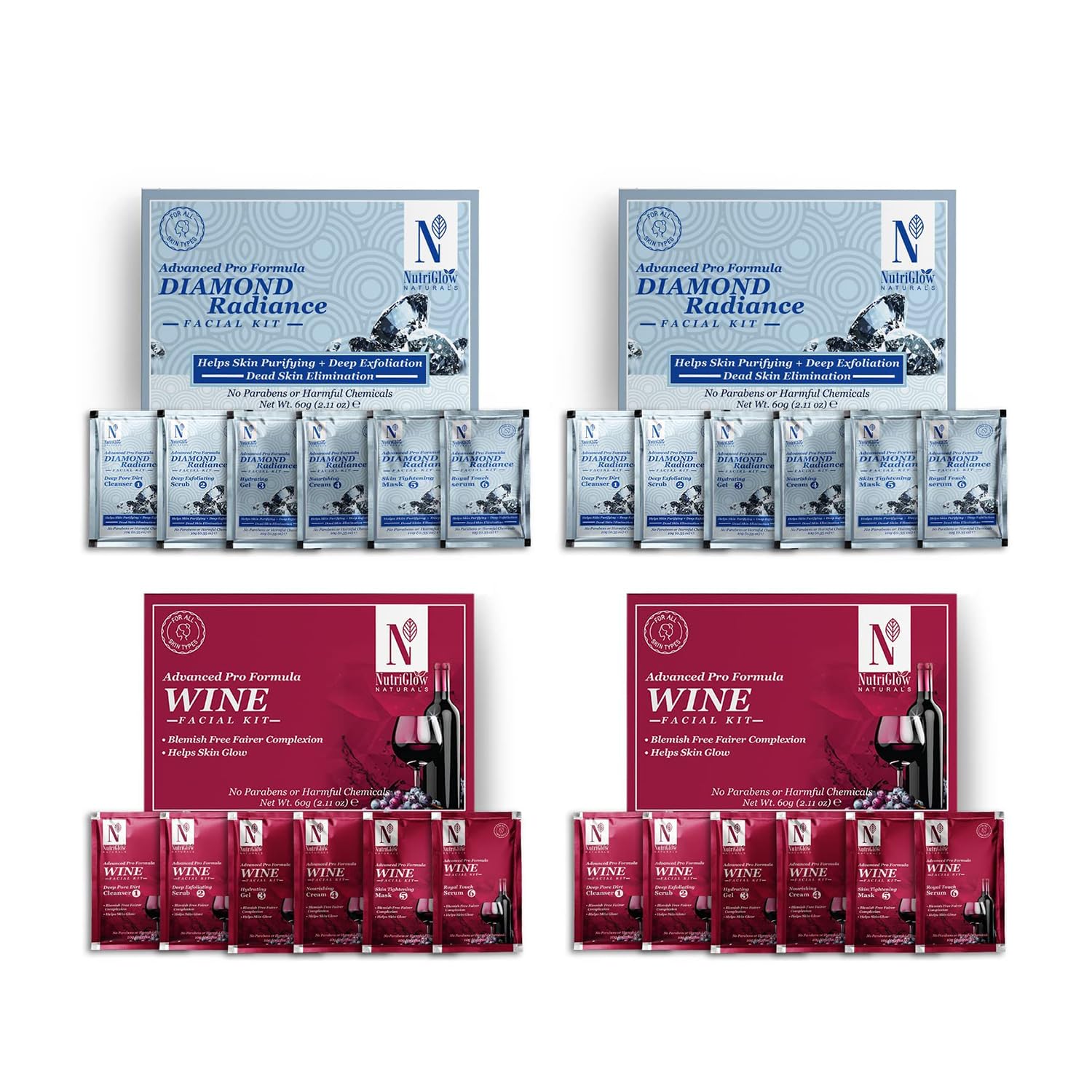NutriGlow NATURAL'S Advanced Pro Formula Diamond Radiance Facial Kit & Wine Facial Kit For Acne & Spot Free Reduces Pigmentation & Removes Blackheads 2.11 OZ Each Combo (Pack of 4)